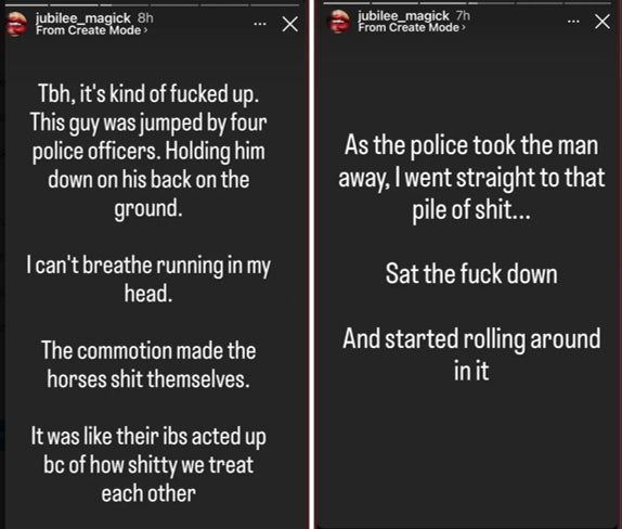 What an idiot. What concoction of drugs and alcohol could possibly lead someone to the point of covering themselves in shit in front of a large audience of phone cameras. She must be so embarrassed, right? Wrong. Horse poop took to Instagram to explain herself.