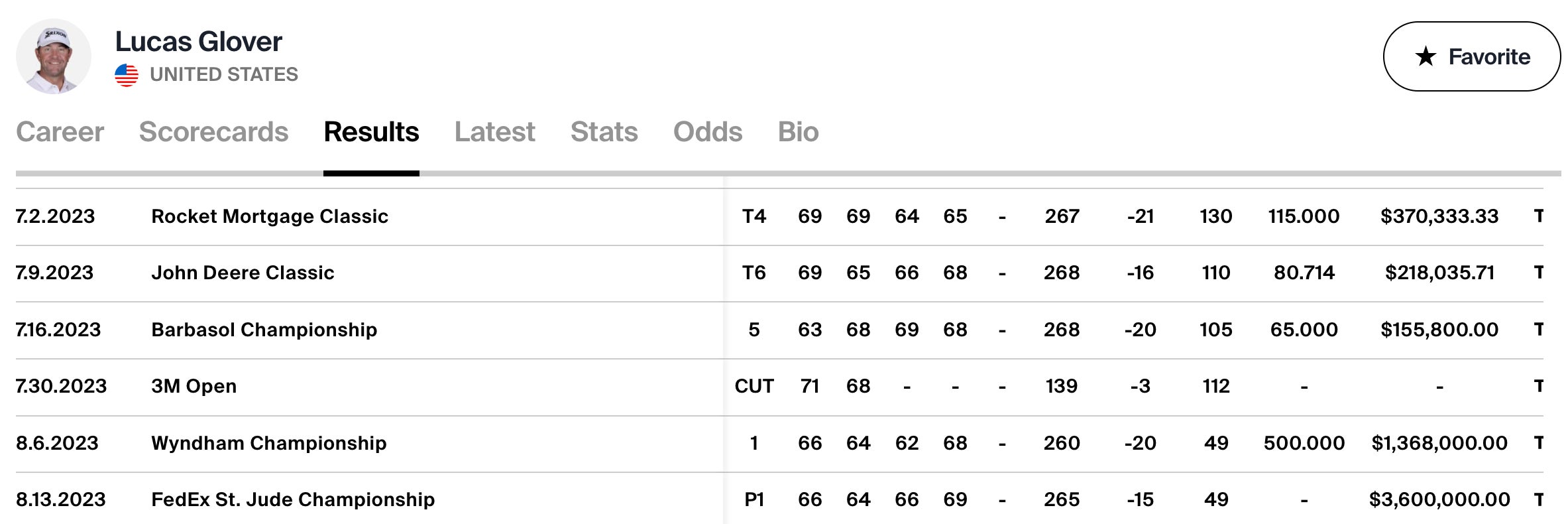 After tying for third at last year's FedEx St. Jude Championship, maybe more of us should've seen Glover's back-to-back victories coming. Couldn't be more grateful that he walked away with the hardware over slow-playing prick Patrick Cantlay. More important than beating Pat-Can, Glover can finally use his sudden meteoric resurgence to give us shorts on the PGA Tour.