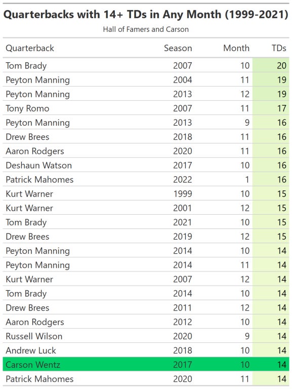 2. Carson joins a list perhaps literally exclusive to hall of fame quarterbacks in throwing 14 or more touchdowns in a given month