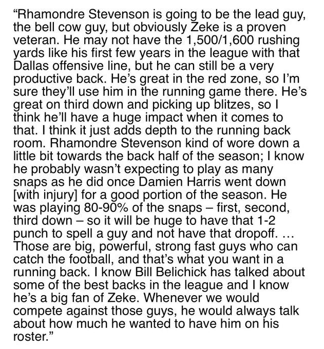 Which is relevant today, because James White went on the NFL's SiriusXM channel and had this to say about Ezekiel Elliott coming to the Patriots: