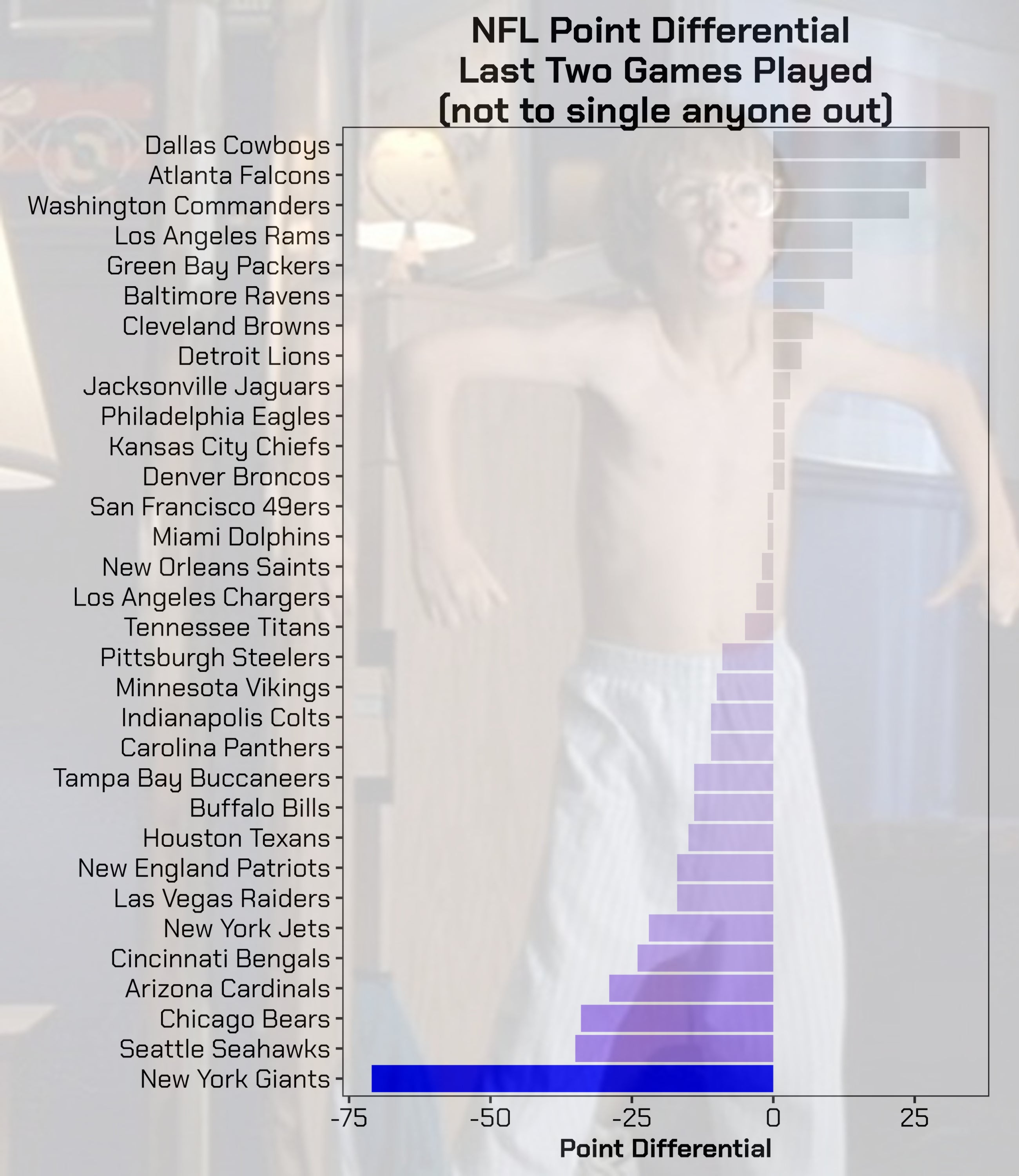 If you've been a fan of a sad team for as long as I have you know there comes a point when all you can do is relish in the misery. That's what this blog is here for. The weekly sad stats blog ran through every regular season week last year helping the downtrodden find humor in a bleak, dark world. And Week 1 2023 wasted no time in vacuuming the new season hope from swaths of stadium goes, bar hoppers, and at home TV remote throwers. If you think you're going to get any light in the darkness, hope you brought your own fashlight.