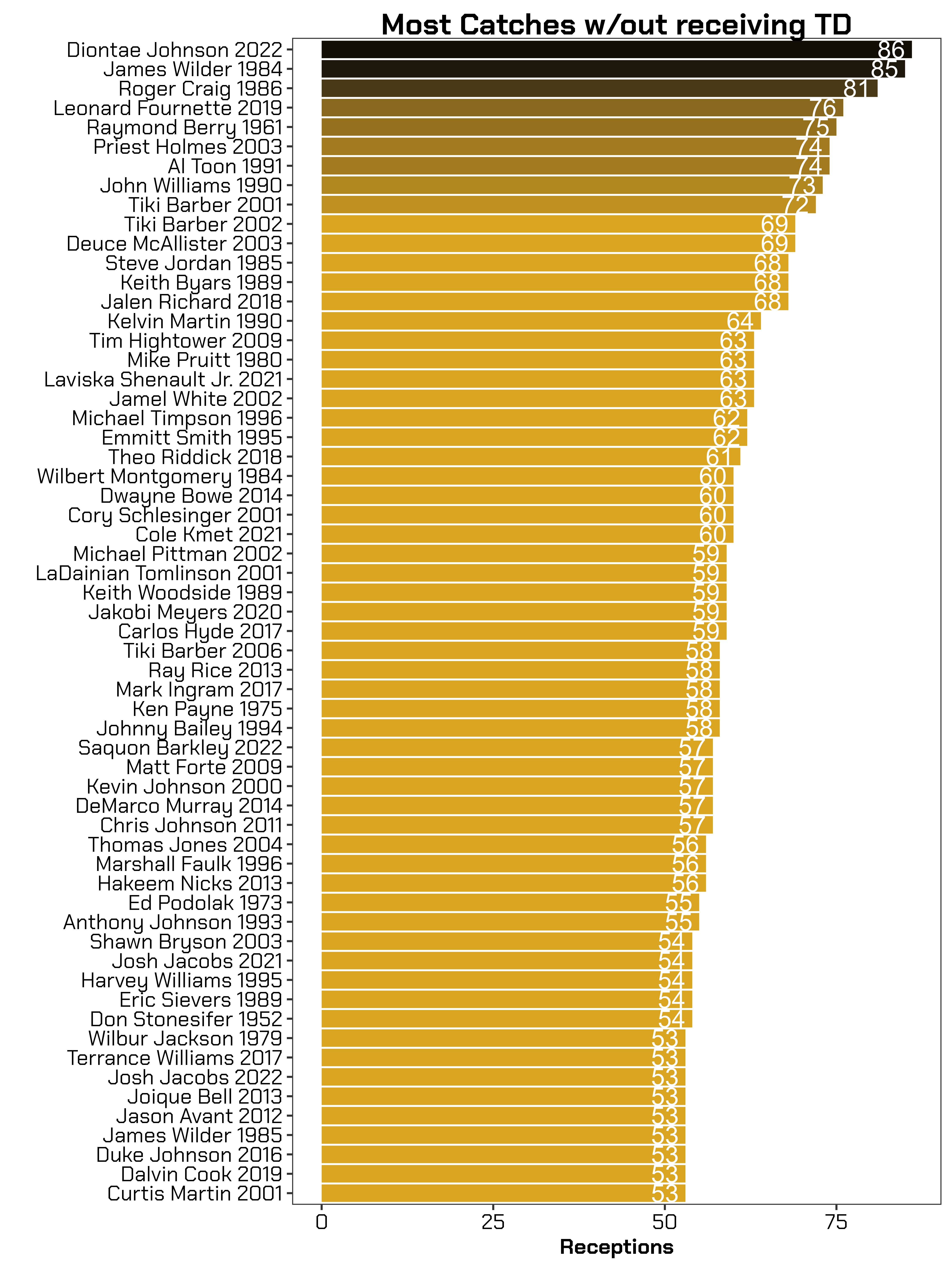 A sad stats reader from last season will recall Diontae Johnson setting the record for most receptions in a season without a touchdown. If you're new I made a fresh graph for reference: