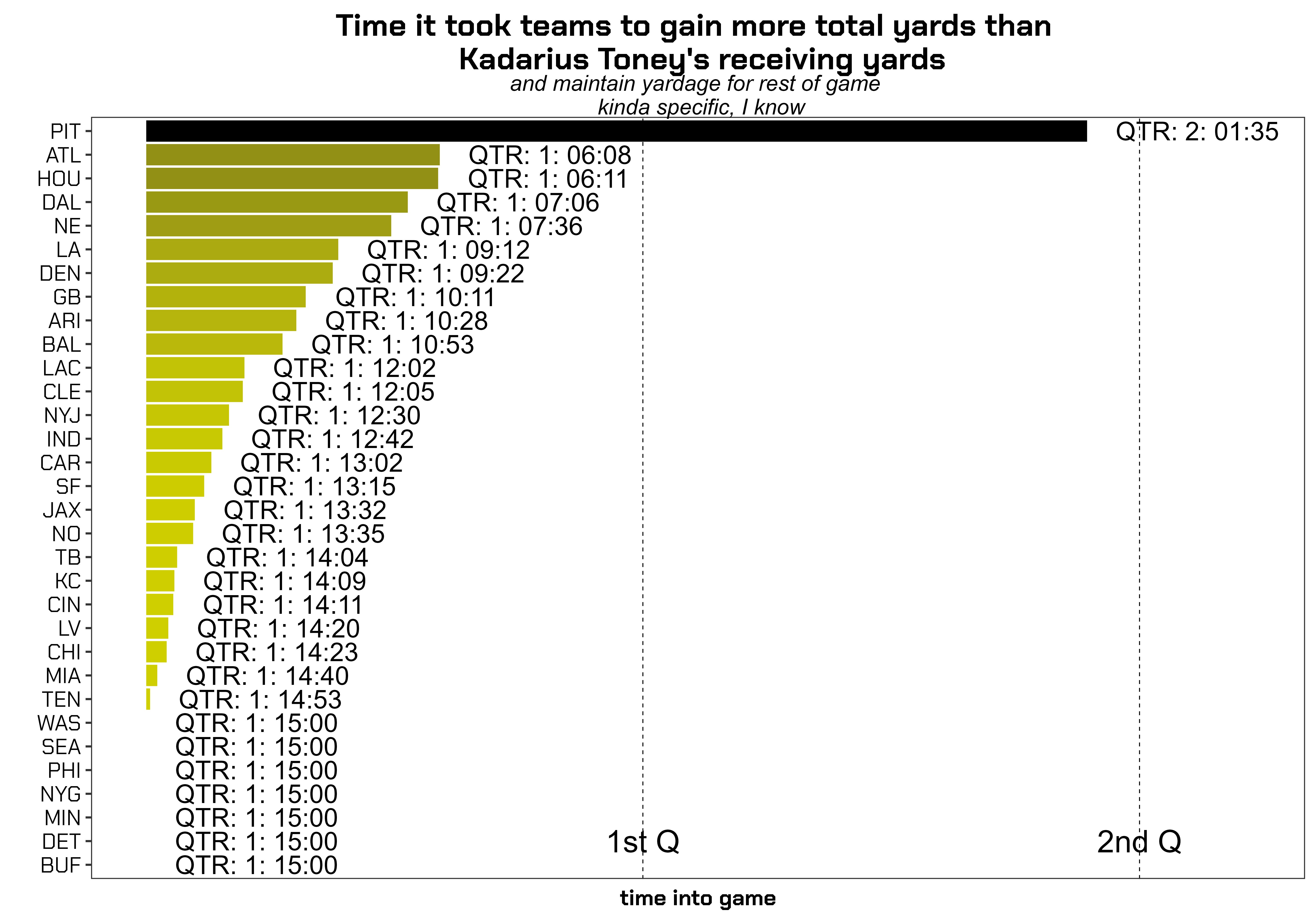 Sad Stat #3: It took the ENTIRE Pittsburgh Steelers into the two-minute warning to surpass Kadarius Toney's Week 1 receiving yards total