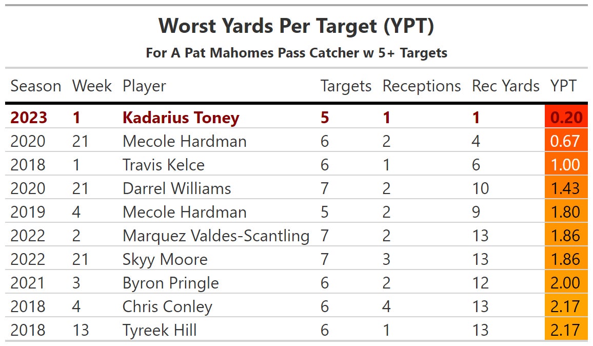 Five targets. One catch. One yard. Imagine getting five targets from Patrick Mahomes and providing 7.2 inches of yardage per play for your team. That's sad to think about. But here's a thought experiment that's even sadder: If Mahomes attempted all 39 of his passes to Toney at this rate, Mahomes would have finished Thursday night with 7.8 total yards passing.