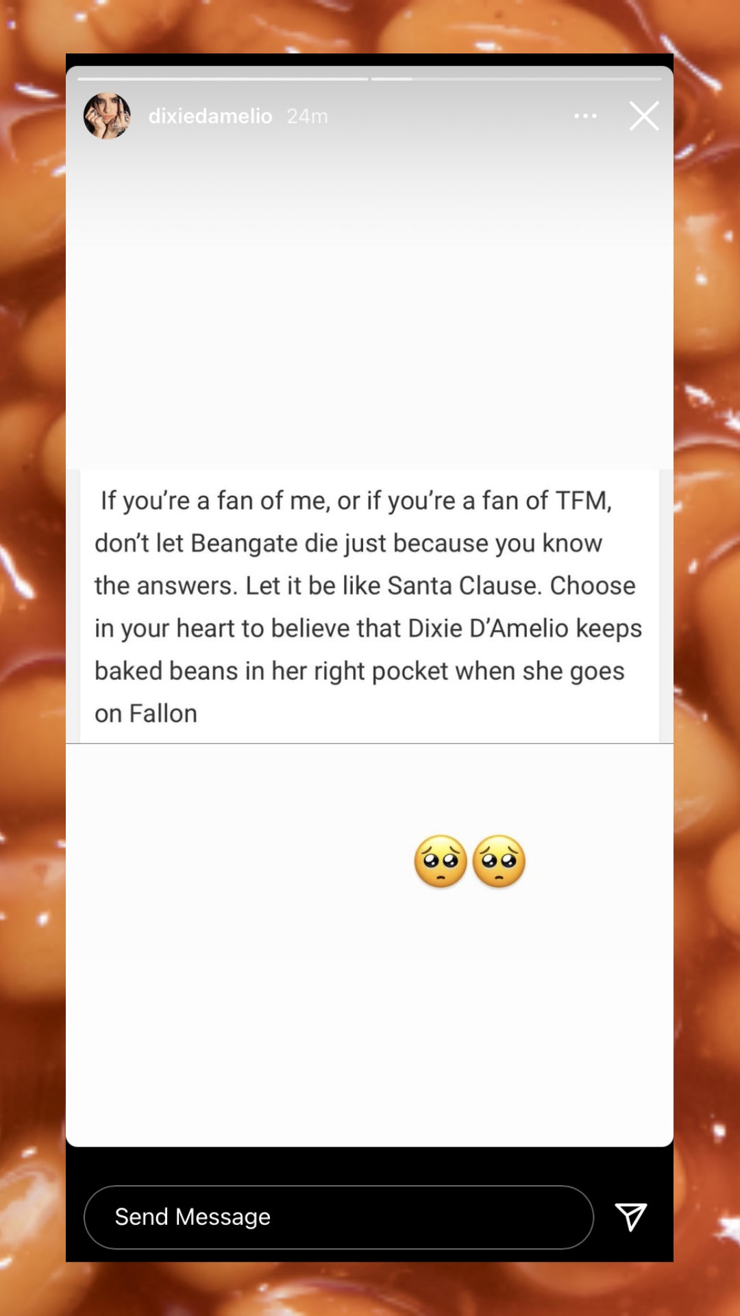 The whole narrative that… Dixie D’Amelio was once a stage fright ridden youth who overcame her challenges by stuffing bags of baked beans in her pocket with the help of her childhood teacher AND still does so til this day…is the most comical internet scenario that has taken off in quite a while, and I’m just so happy to have been a part of it.