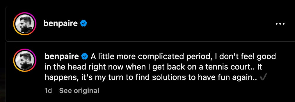 Benoit is no stranger to tanking and throwing away matches. In fact, it's become his calling card as I've detailed on the blog before. It all kinda started around covid when fans vanished from the stands due to safety protocols. He likened it to playing in a prison and lost all the joy with the sport. He completely lost his mind.