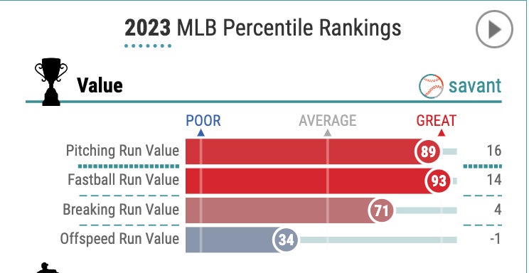 Baseball Savant has a value system they put on pitches. Look how low his fastball was in 2021 with my stupid team.