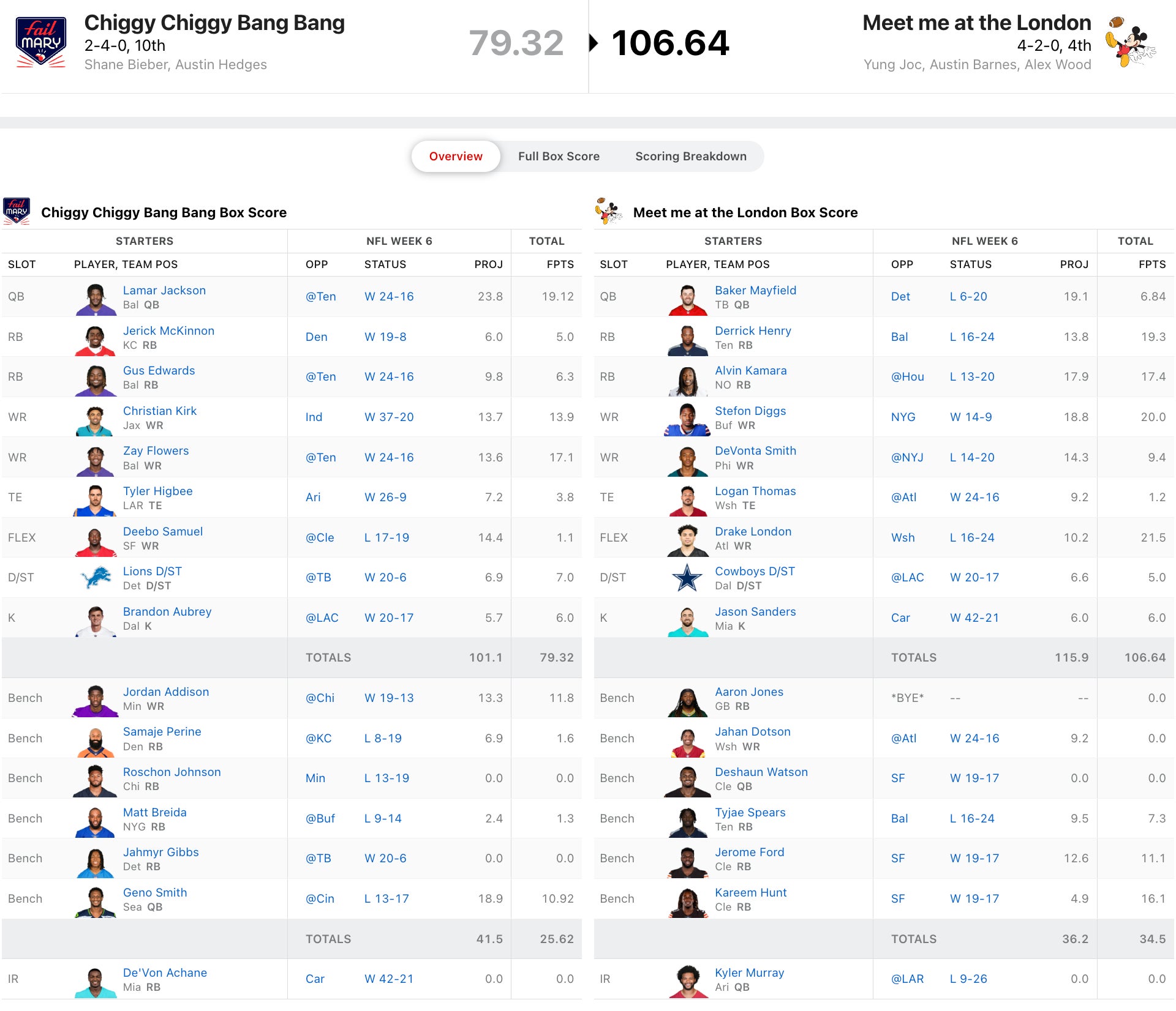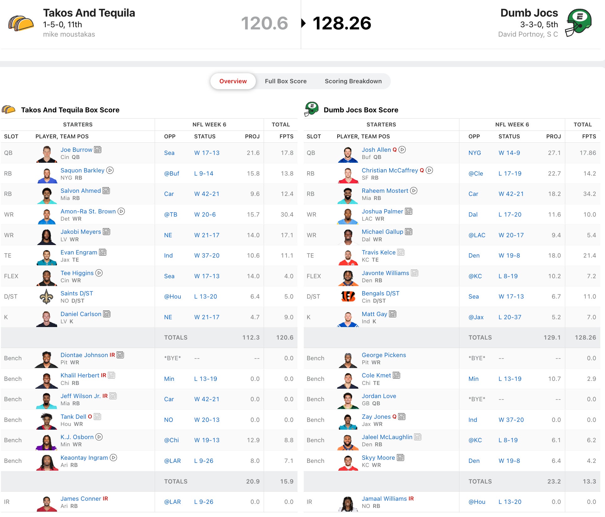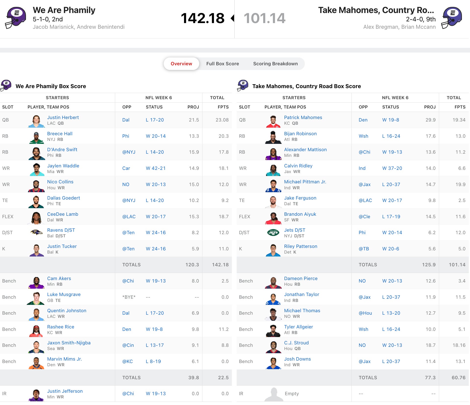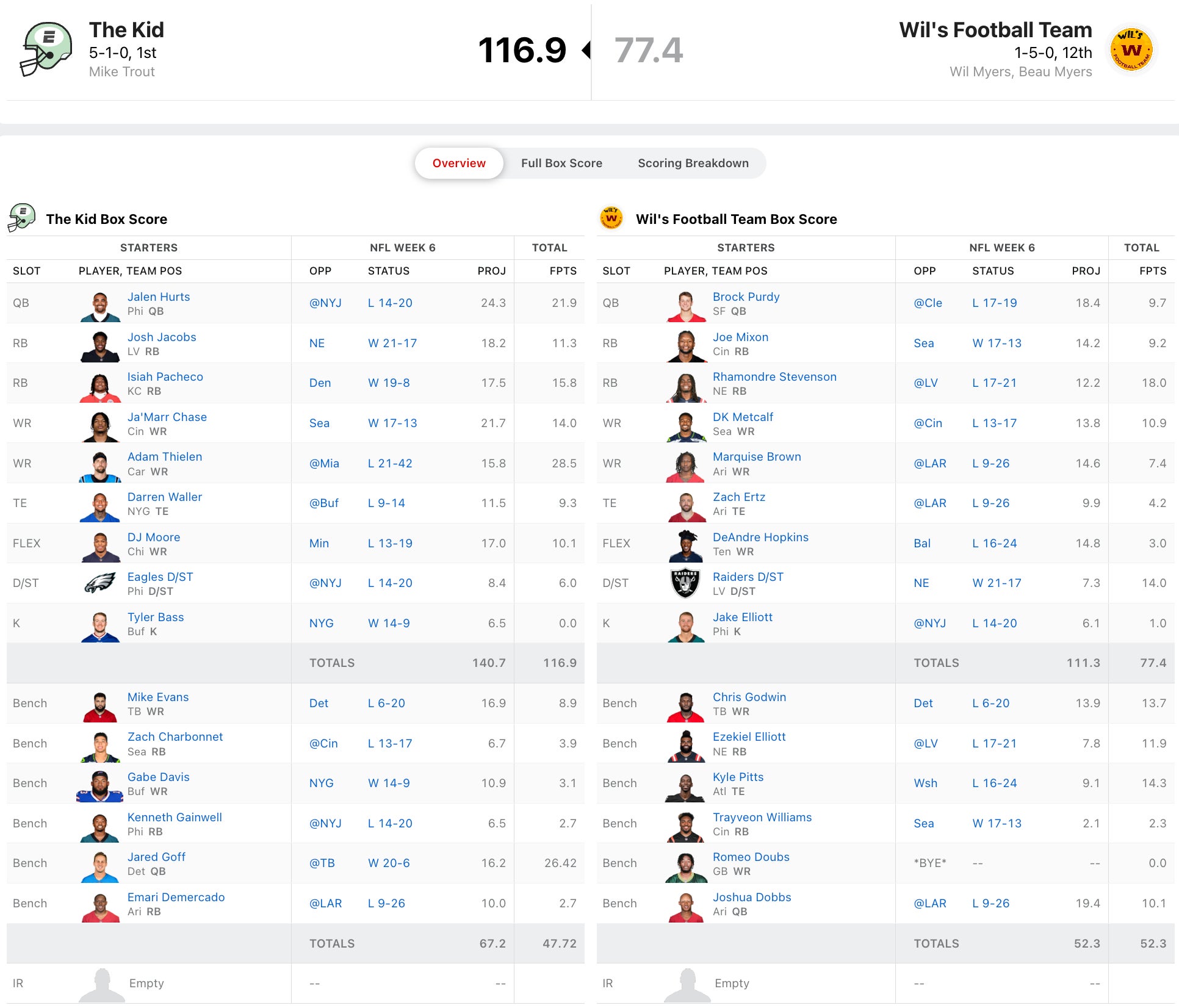 Even with Justin Jefferson on IR they put up an impressive 142.18 points in Week 6. Every player except Nico Collins and Dallas Goedert outdid their projection and Breece Hall looks all the way back from his injury last year. On the other side, the duo of Alex Bregman and Brian McCann have been struggling like their franchise QB Patrick Mahomes (in fantasy only). They only had two guys beat their projection in Michael Pittman Jr. and the Jets D/ST. It's been tough sledding for that group but they'll need Mahomes to find his way and Jonathan Taylor to regain his 2021 form to compete.