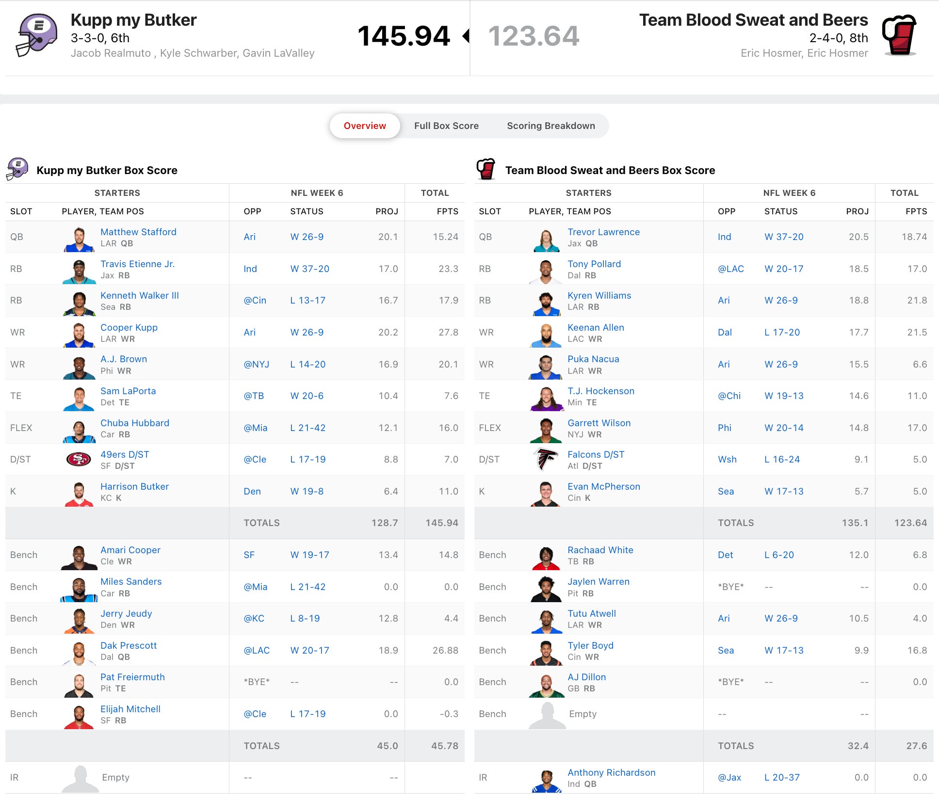 But on the fantasy field too ever since Cooper Kupp came back from injury. The PPR dynamo led their squad again with 27.8 points. They also got 41.2 points out of their young backfield featuring Travis Etienne and Kenneth Walker III. Meanwhile, Hosmer fell short on Monday night with Tony Pollard and Keenan Allen's missed connections costing him the game.
