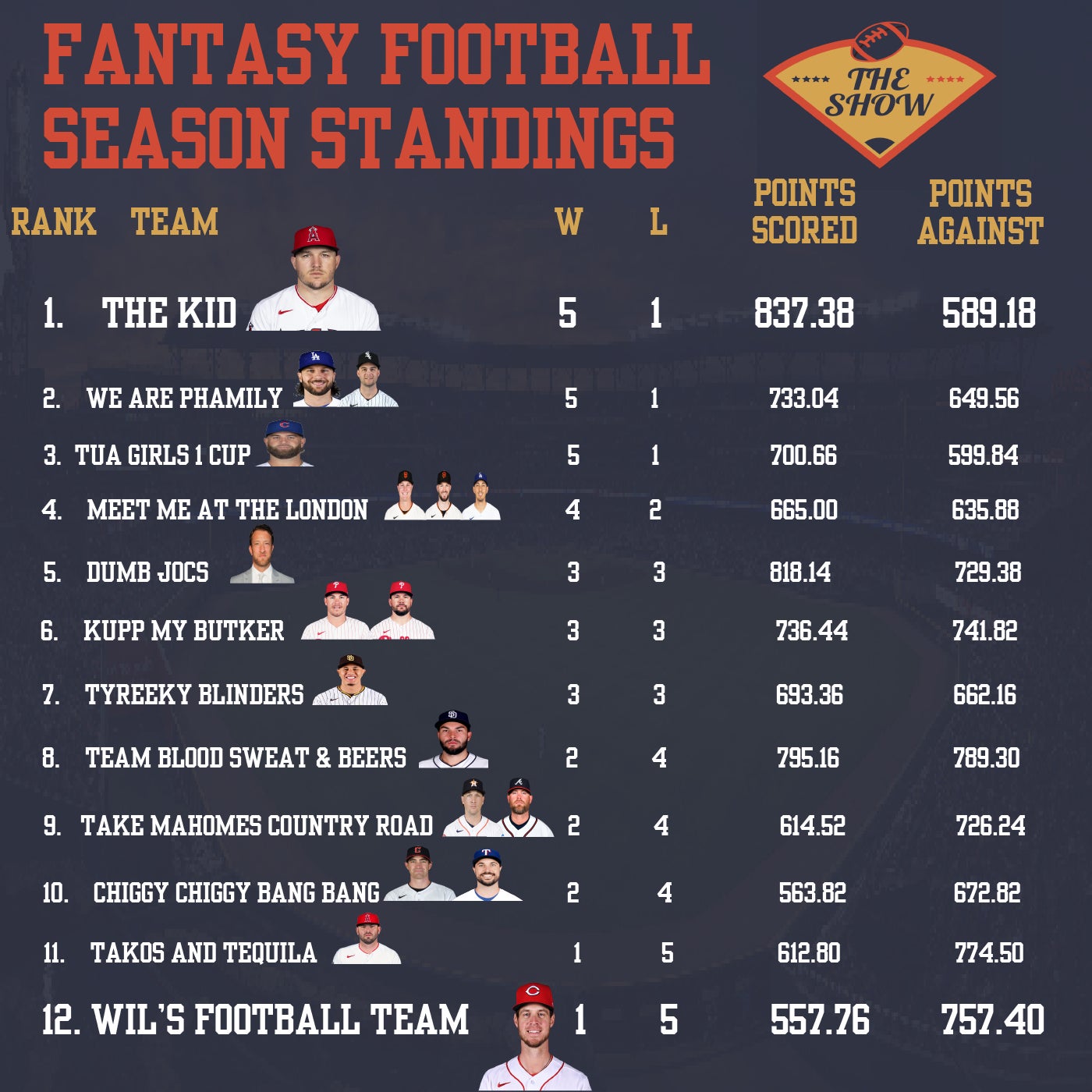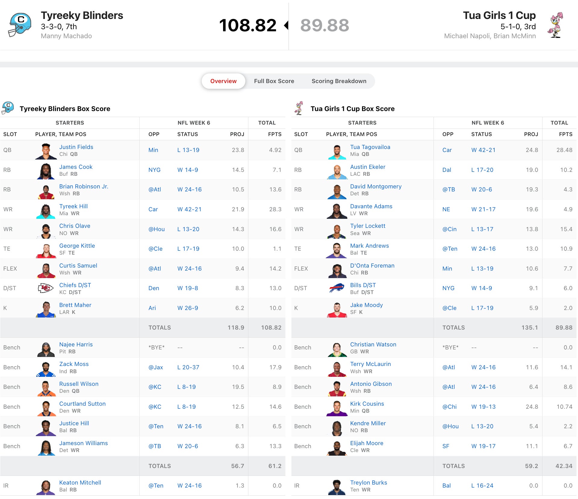 We had a major upset this week with Manny Machado getting firmly back in the fold at 3-3 taking down previously undefeated Mike Napoli. Tyreek HIll put the team on his back again with 28.3 points but he's got a big question mark at QB with Justin Fields going down.
