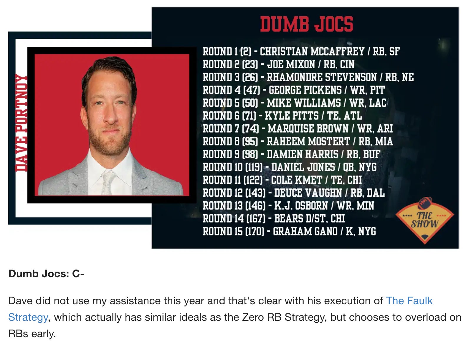 Dave Portnoy is a gambling guy. He's not a seasoned fantasy football veteran. I gave him the 2nd lowest draft grade in the entire league.