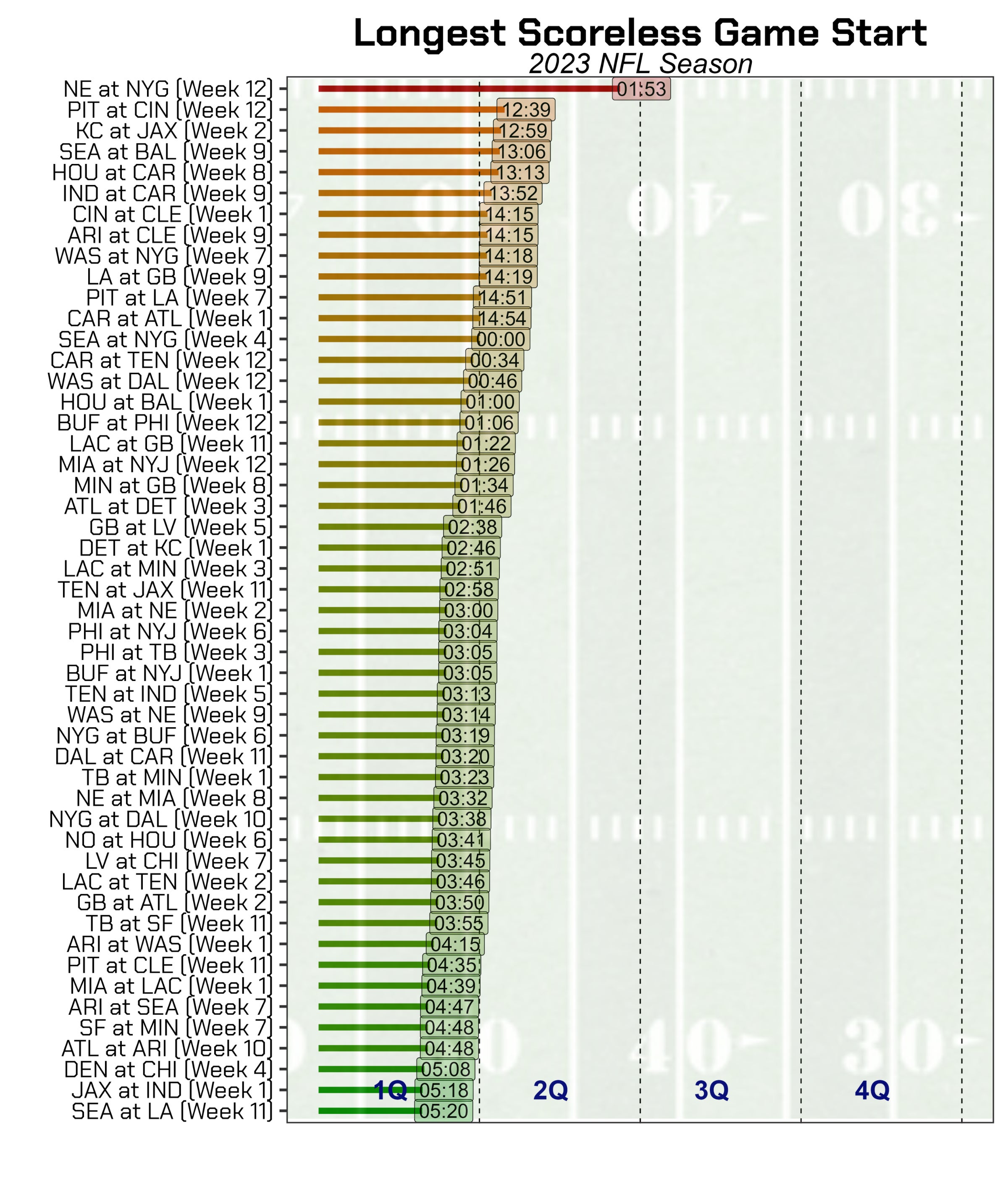 Sad Stat #5: The Giants flinched first in the Tank Bowl vs the Patriots as this game took 10 minutes of game time longer than any other game this year for a point to be scored