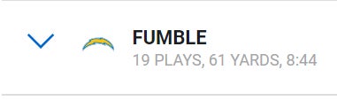 19 plays. 8:44. The Chargers third fumble of the night was the charm as this drive amounted to 35.2% of their total time on offense vs the Jets' 35.1. Never underoverestimate the Chargers.