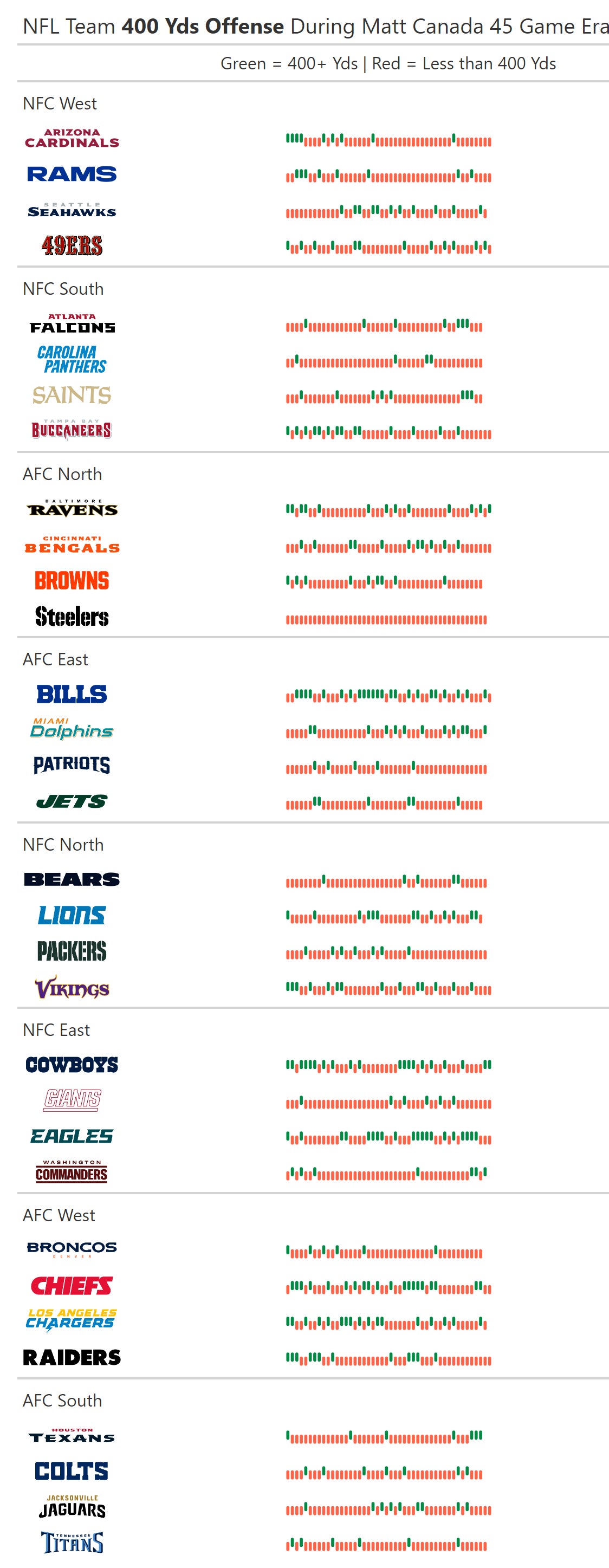 The Steelers finally broke the 400 barrier. Not exactly Roger Banister level impressive, but hey, 58 games is a long time to be that consistently anemic. For some perspective, I went ahead and compared every team's outcome in topping 400-yards during the Matt Canada era below. Each mark is a game in chronological order from left to right. Green means that team gained 400+ yards and red means they didn't.