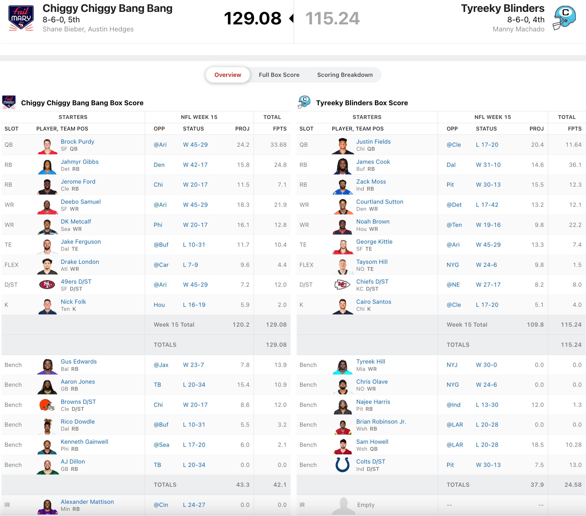 Biebs and Hedges have used the Brock Purdy/Deebo Samuel stack to climb into the playoffs and they are dangerous. With explosive weapons like Jahmyr Gibbs, DK Metcalf, and Drake London, who could all go off at any given week, this team should give Mike Trout all he can handle in the next round. On the other side, Manny had a great season and got a heck of an effort from James Cook and Noah Brown. But Justin Fields had an off-game at the wrong time and his top 2 RBs being out along with Hill and his WR2 in Chris Olave proved more than he could handle.