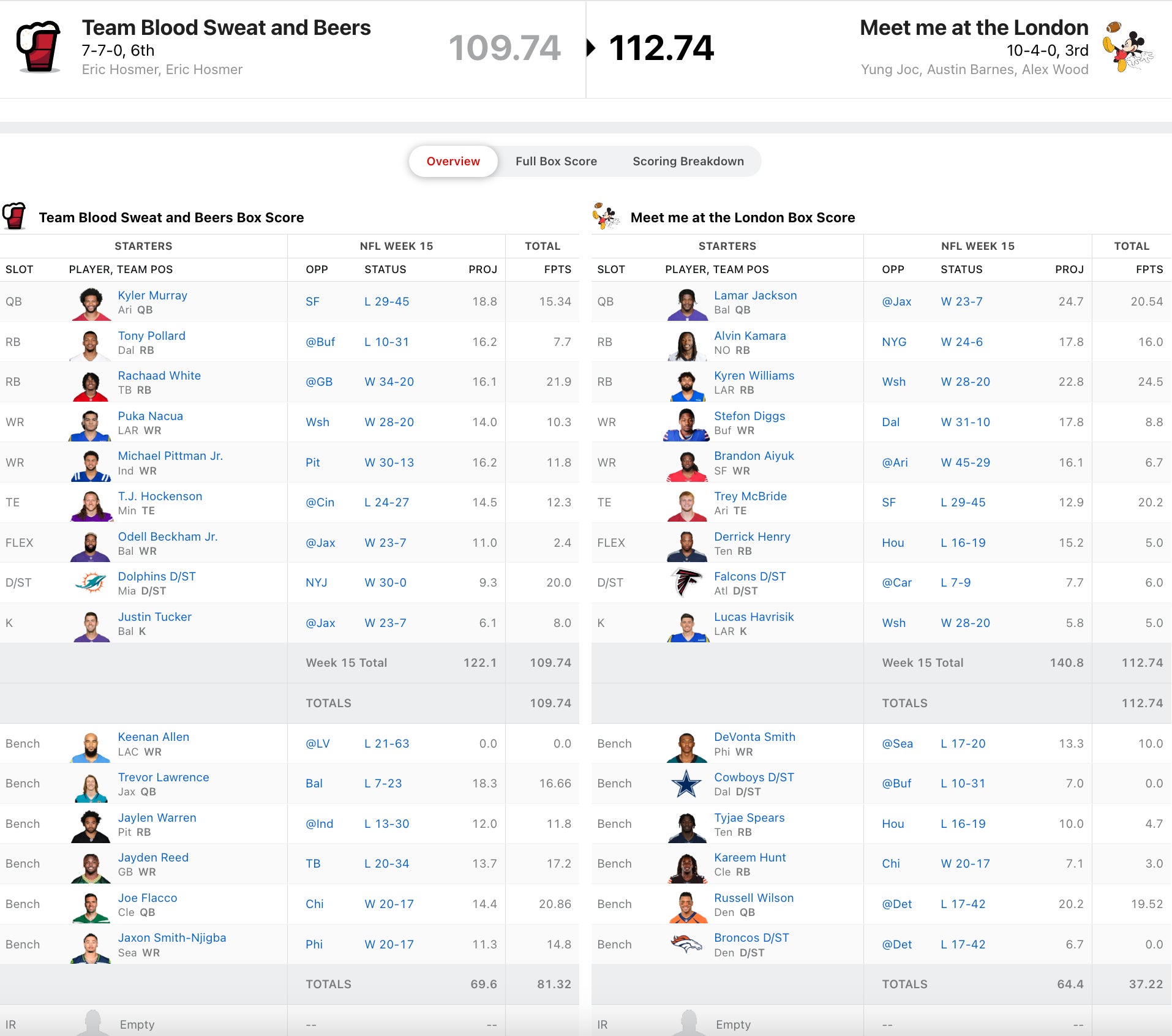 Hoz certainly regrets starting Kyler Murray over Joe Flacco, which would have changed the outcome. But he had some tough luck, with Michael Pittman Jr. going out of the game early and Odell Beckham Jr. falling 8.6 points below projection. Tony Pollard's numbers tanked after the Cowboys fell behind by so much and that was all she wrote. Credit to the Joc/Wood/Barnes trio as they got enough from Kyren Williams, a late season addition via trade and Trey McBride. Benching the Cowboys D/ST was also a bold move which gave them the win. They'll move on to play the #2 seed, Jake Marisnick and Andrew Benintendi in the semi-finals this weekend for a shot at the title game.