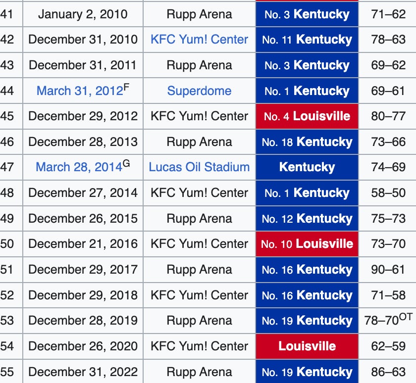 Will I always hate Louisville? Of course, it's in the blood when you go to Kentucky and vice versa. But the basketball rivalry is dead. It's over. This is how bad Louisville is. You can't have opposing fans come into your building and take it over like that. That doesn't happen in rivalries, no matter how great one side (blue) is vs the other. No matter how great one fanbase (blue) is vs the other.