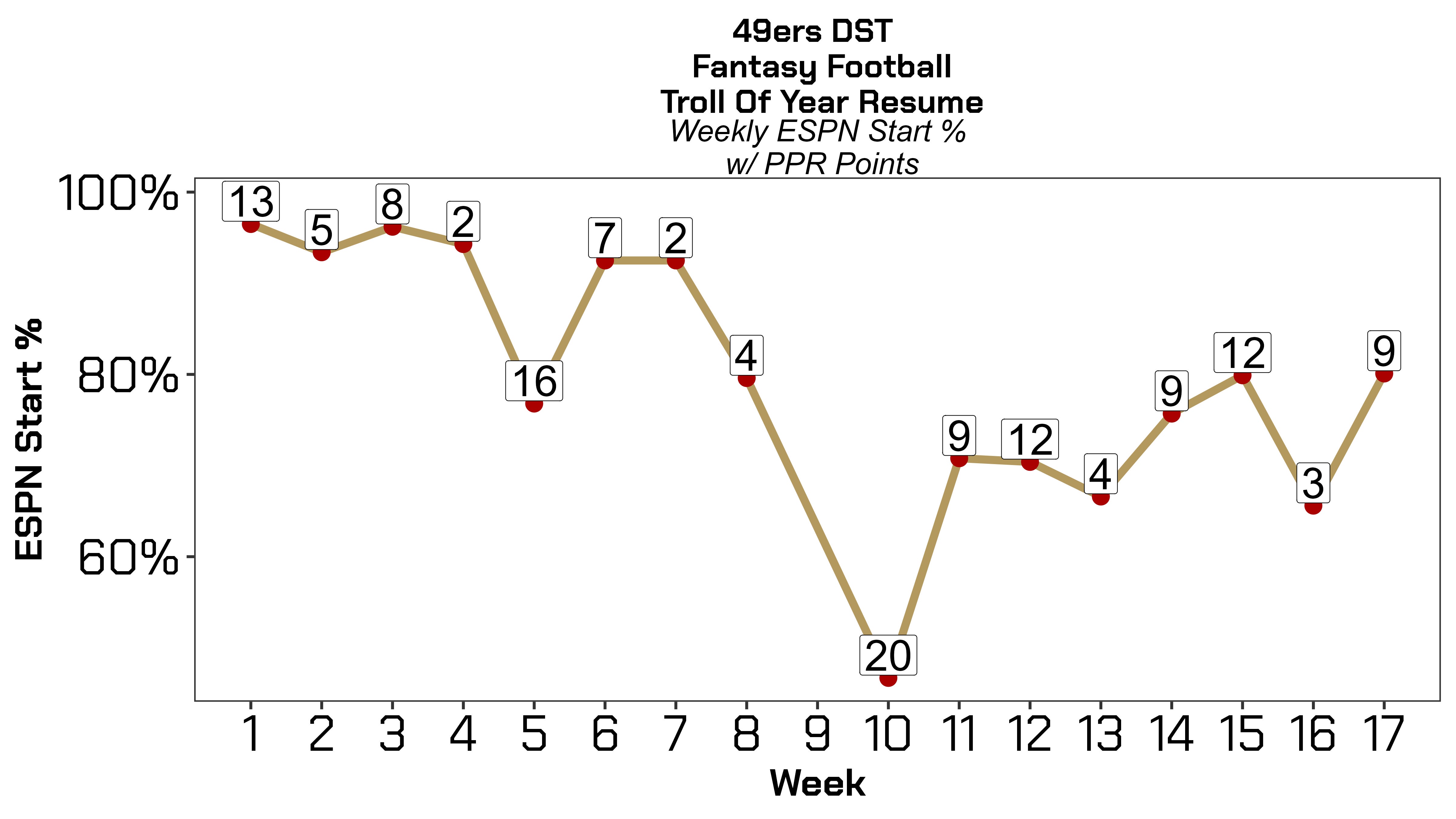 At almost 100 percent started, the 49ers showed up in Week 1 to set an anchor bias into their manager's psyche. After three mediocre at best weeks 2-4, they came alive with 16 points after about 20-25 percent of teams took them out. Rinse and repeat for weeks 6-10 as they served up their plat du jour in Week 10 with an equisite recipe of contrasting flavors including their highest scoring week of the season together with their lowest start percentage of the season. All fantasy managers could do was watch it marinate.