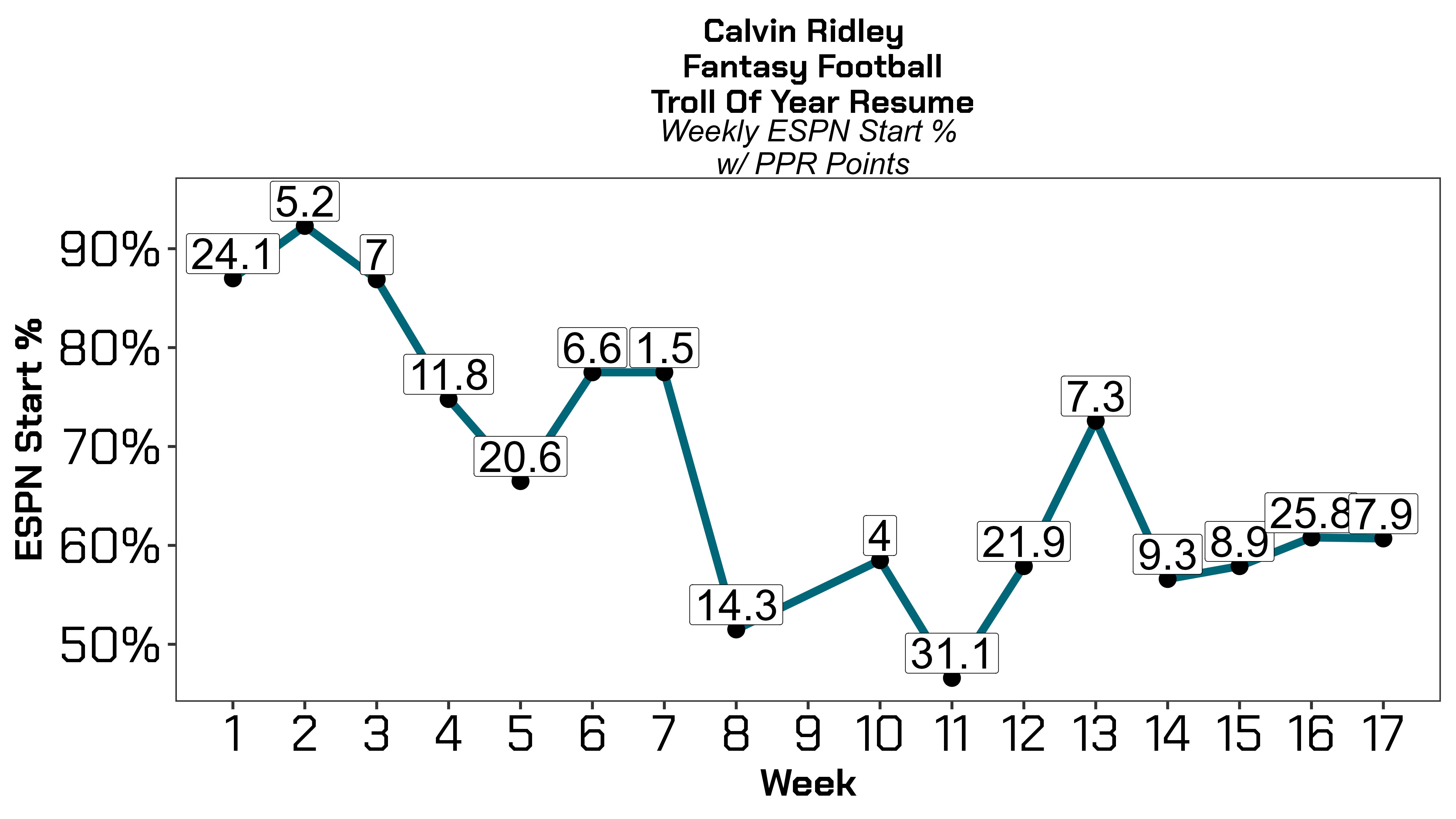 Calvin Ridley was Mr. Preseason training camp social media clip porn. And he came out of the gate in Week 1 firing up guys like me that loved him as a breakout candidate and potential top-5 receiver. From Week 2 through Week 5 he was trusted less and less by managers with a solid 20.6 outing before a Week 6 dud and Week 7 super dud. That gave 30 percent of managers the hook line and sinker to bench him for a decent Week 8. But Week 10 disappointed once again to set up his crushing blow.