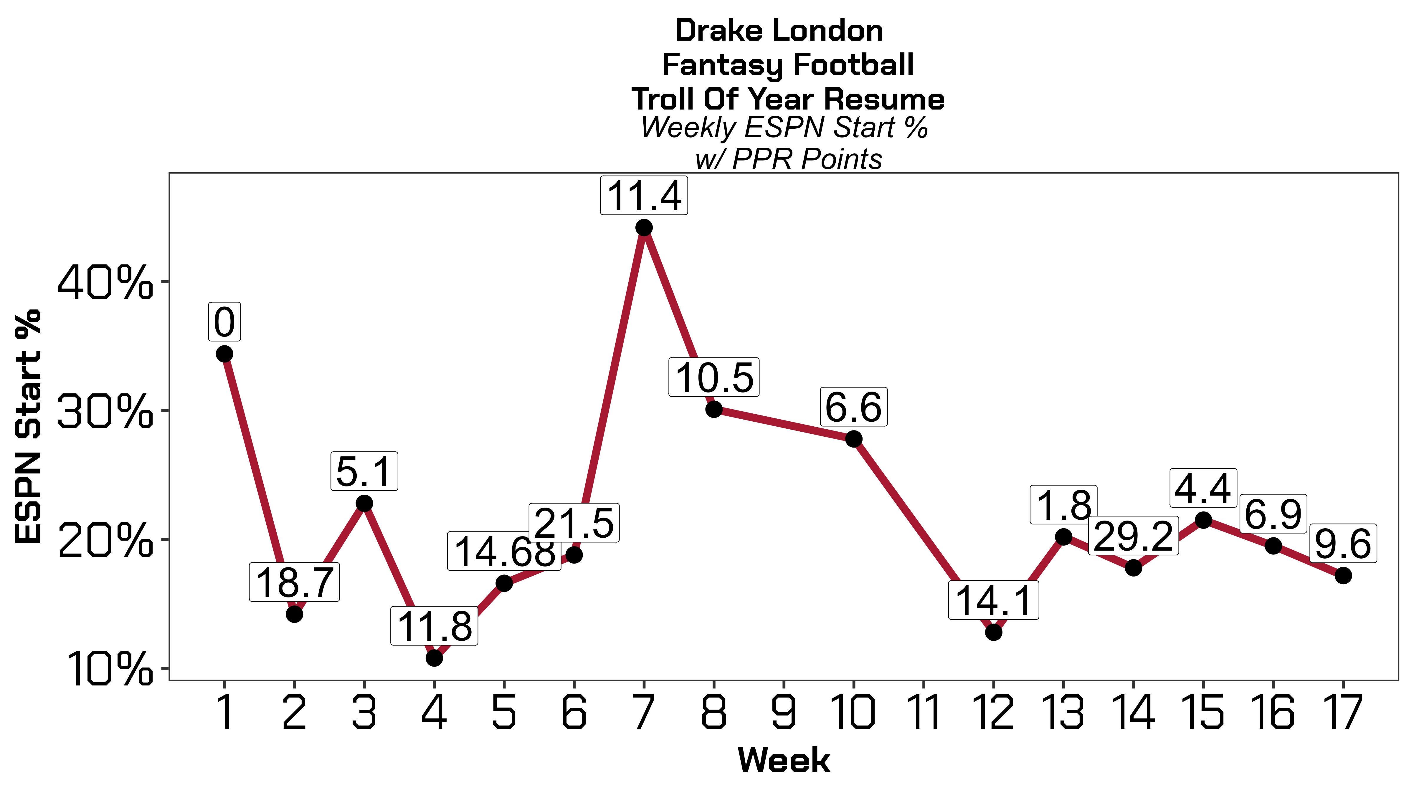 But there are some key blemishes with annointing a Troll of London. Week 7 was set up to be an epic stinker and he came up short by not coming up short. The Week 14 blowup was nice too after a 1.8 point Week 13 but variability in start percentage just wasn't quite there.