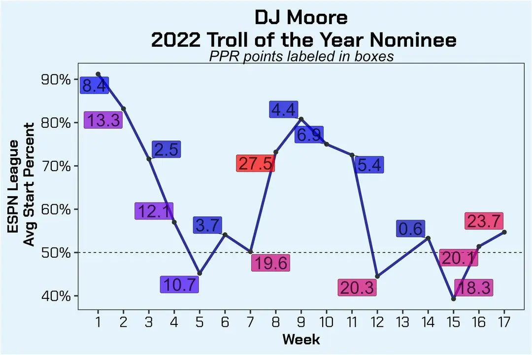 And DJ Moore last season. (Sorry the y-axis is different from the earlier versions. We're sticking with start percent from here on out)