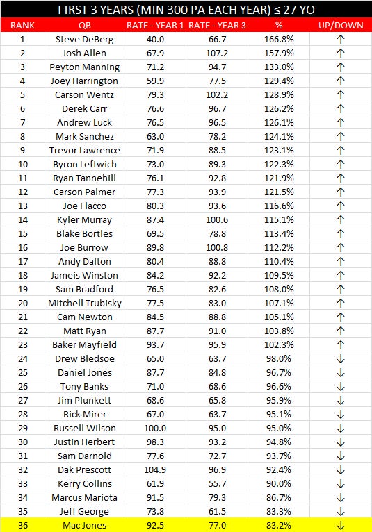 Even if you allow for the fact that that's a pretty specific set of parameters and that there's no direct correlation between where a guy appears on this ranking and how successful his career was (Steven Deberg vs. Peyton Manning, Mitchell Trubisky vs. Russell Wilson), it's still a terrible look for Jones. I say this as a guy who doesn't understand the Passer Rating formula, but respects that it is an accurate measure of performance. When your third season is just 83.2% as productive as your rookie season, that sets off the Red Alert siren. As much as I'd like to try, I don't know where to begin putting coats of varnish on that turd.