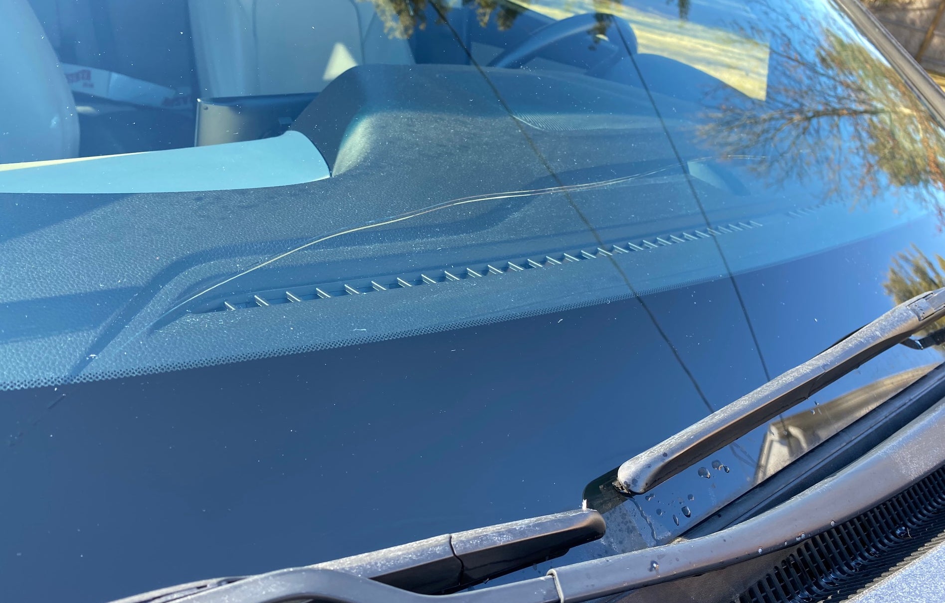 With the defrosters turned up to 83, the windshield got pretty fucking hot, and when something hit it, the entire windshield cracked horizontally just above the bottom of the dashboard, and continued three and a half feet across, the same length as the defroster vent inside.