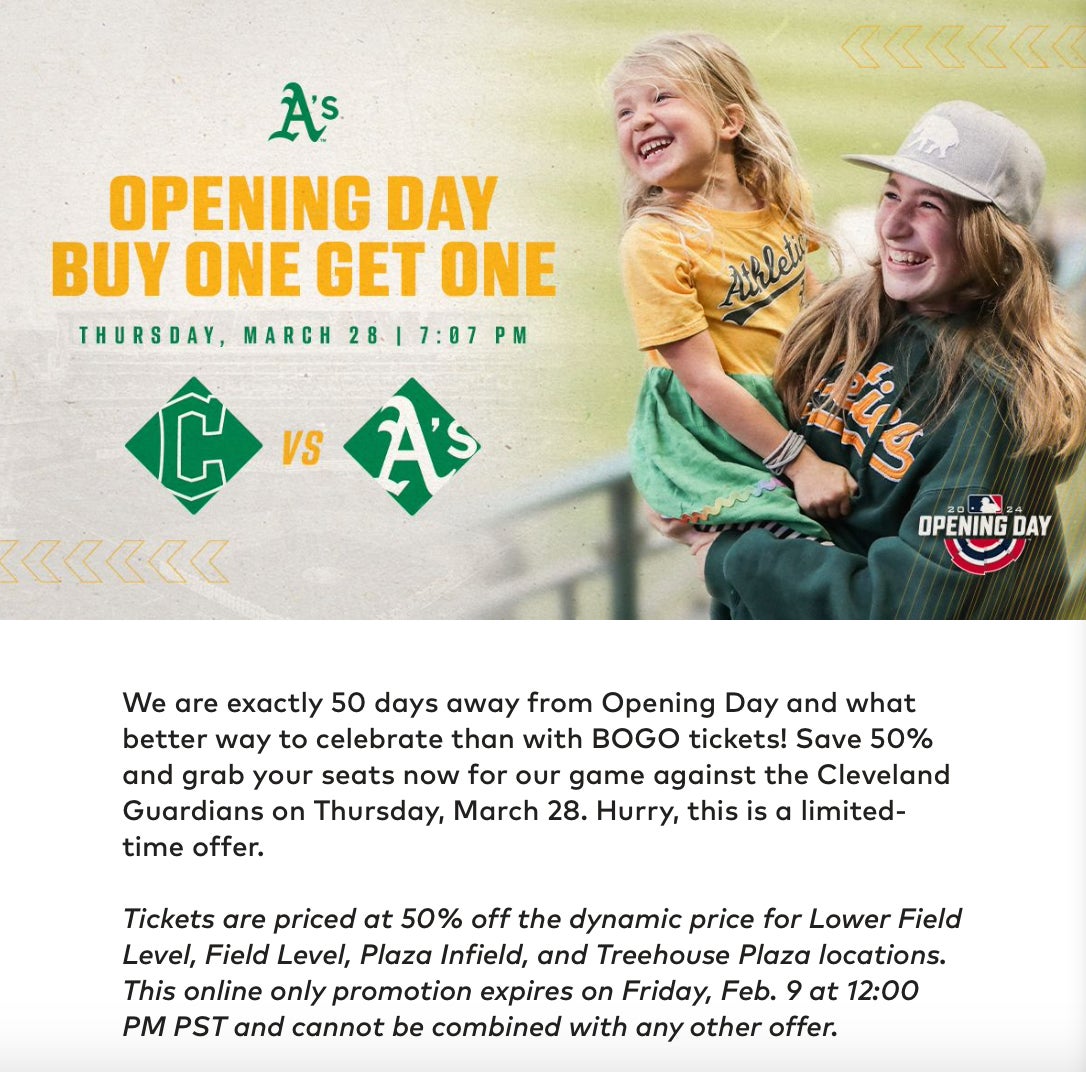 Opening Day tickets at most MLB ballparks are super hard to get. If your team is bad it's usually the only time a year that you get to boas and brag about a full sellout crowd, never easy to find tickets to these first games. It's basically a holiday for your team, Opening Day tickets are sacred. So that is why it's so wild that the Oakland Athletics are doing a ticket promo on Opening Day where if you buy a ticket, you'll get another ticket for free. An Opening Day BOGO is unheard of! You just don't see BOGO offers at any professional sporting event, let alone on Opening Day! You may wonder why they are even offering BOGO and having trouble getting they fans to actually come to the game? Most teams have already sold out of Opening Day tickets, so why not Oakland?