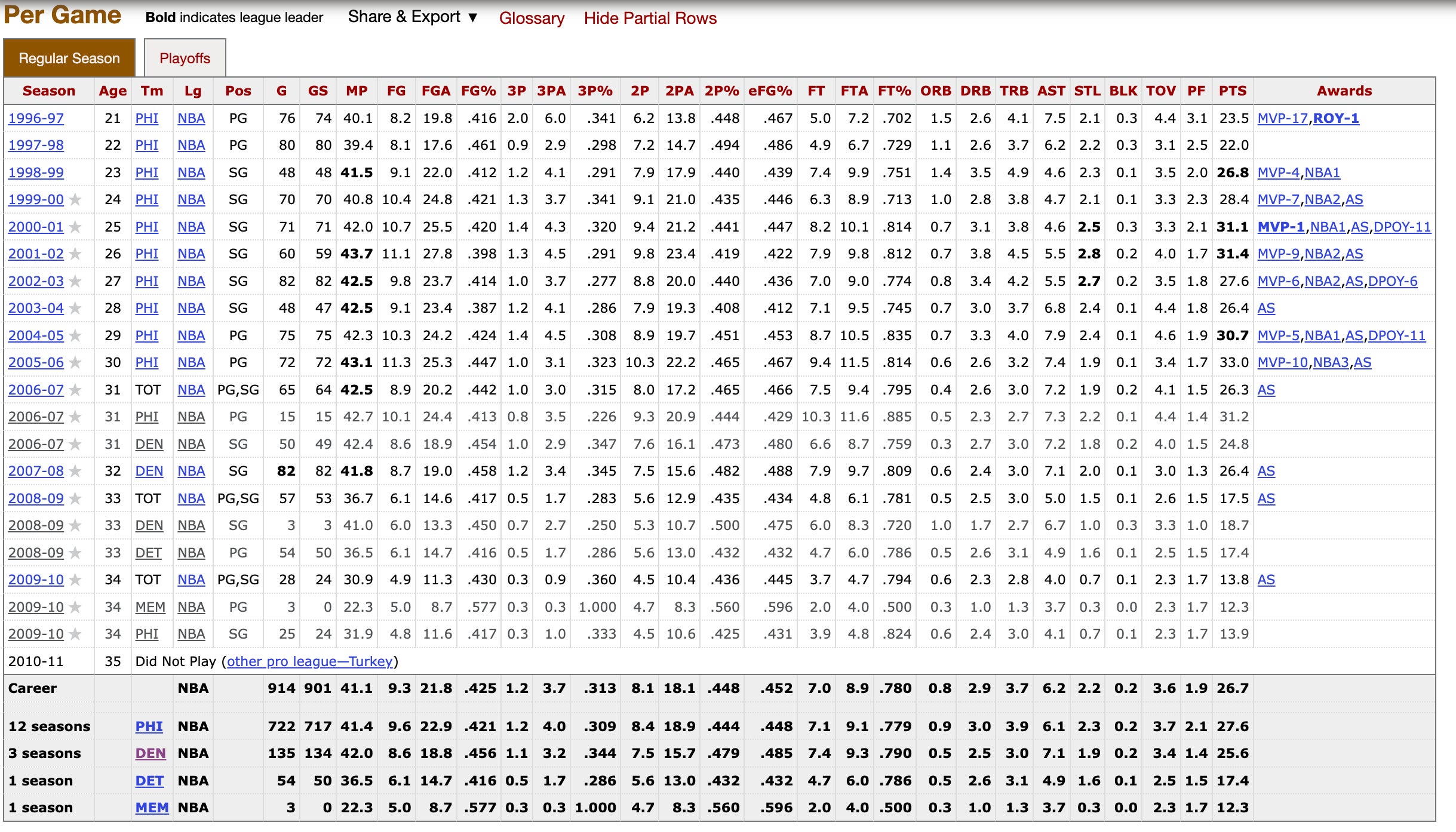 He very well could have been putting up 35+ a season and that might not even be doing him the proper justice. I know there are some who consider Iverson just a shot chucker and get their panties all in a bunch about his efficiency, but to that I say grow up. Iverson changed how the game was played during his time in the NBA, and it didn't even matter if you weren't a Sixers fan. Every kid during that era practiced the Iverson crossover. We all had the Iverson shoe too.