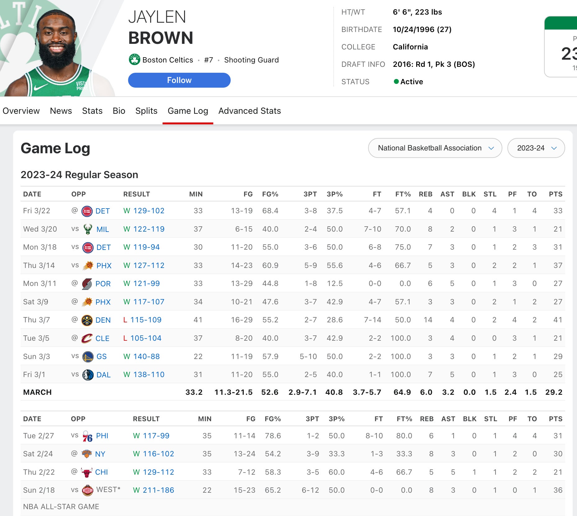 The numbers since the All Star Break are even better than you may think. 28.8/6.1/3.2 on 54.3/41.4% with 2.8 3PM and just 1.6 TOs a game in the 13 games since the break. Oh, and the Celts have gone 11-2 over that stretch.