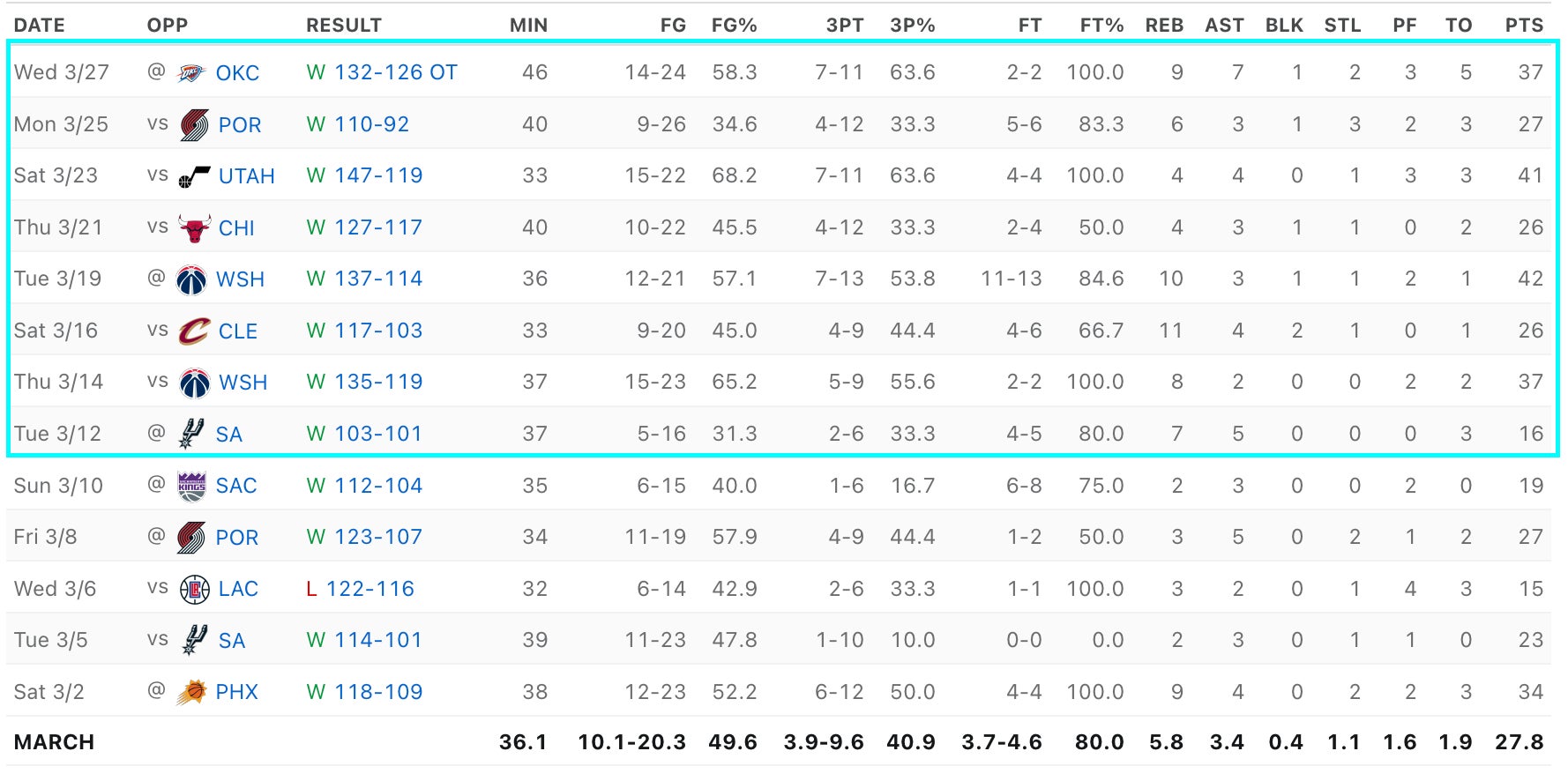 Over the last seven games, he's averaging 34 ppg, 7 boards, and and 4 assists, all Rockets wins. And tonight's game in Oklahoma City was their signature win and Green was spectacular with 37-9-7 including wow play after wow play and clutch baskets galore.