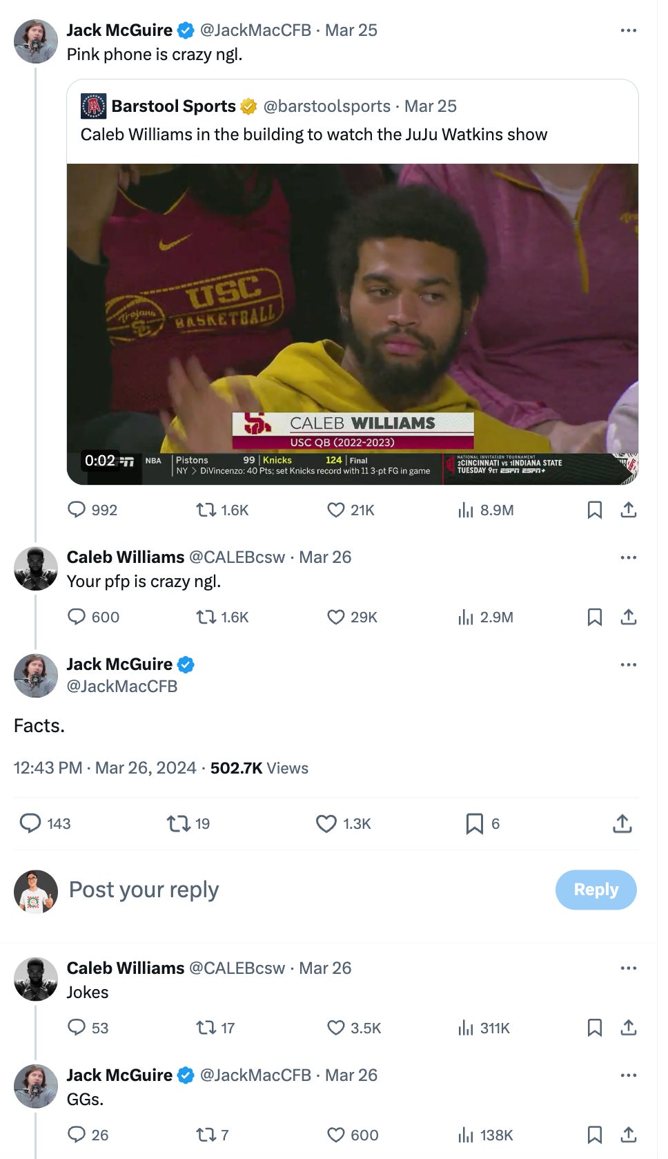 Justin Fields is having a Primanti Bros. sandwich far away from Chicago. With no other starting QB on the roster, it's clear that they're going with a signal caller. Caleb Williams is most people's top guy. He's got incredible escapability and arm talent. But I would openly question if he's built for NFL Quarterback life. And this has nothing to do with painted nails or a pink phone case. However, if your'e insecure enough to be responding to Jack Mac (who is the best) making fun of your phone case, how will you handle it when the spotlight is 1,000X brighter? This is simply not QB1 behavior. Also shoutout to Jack Mac the engagement gawd.