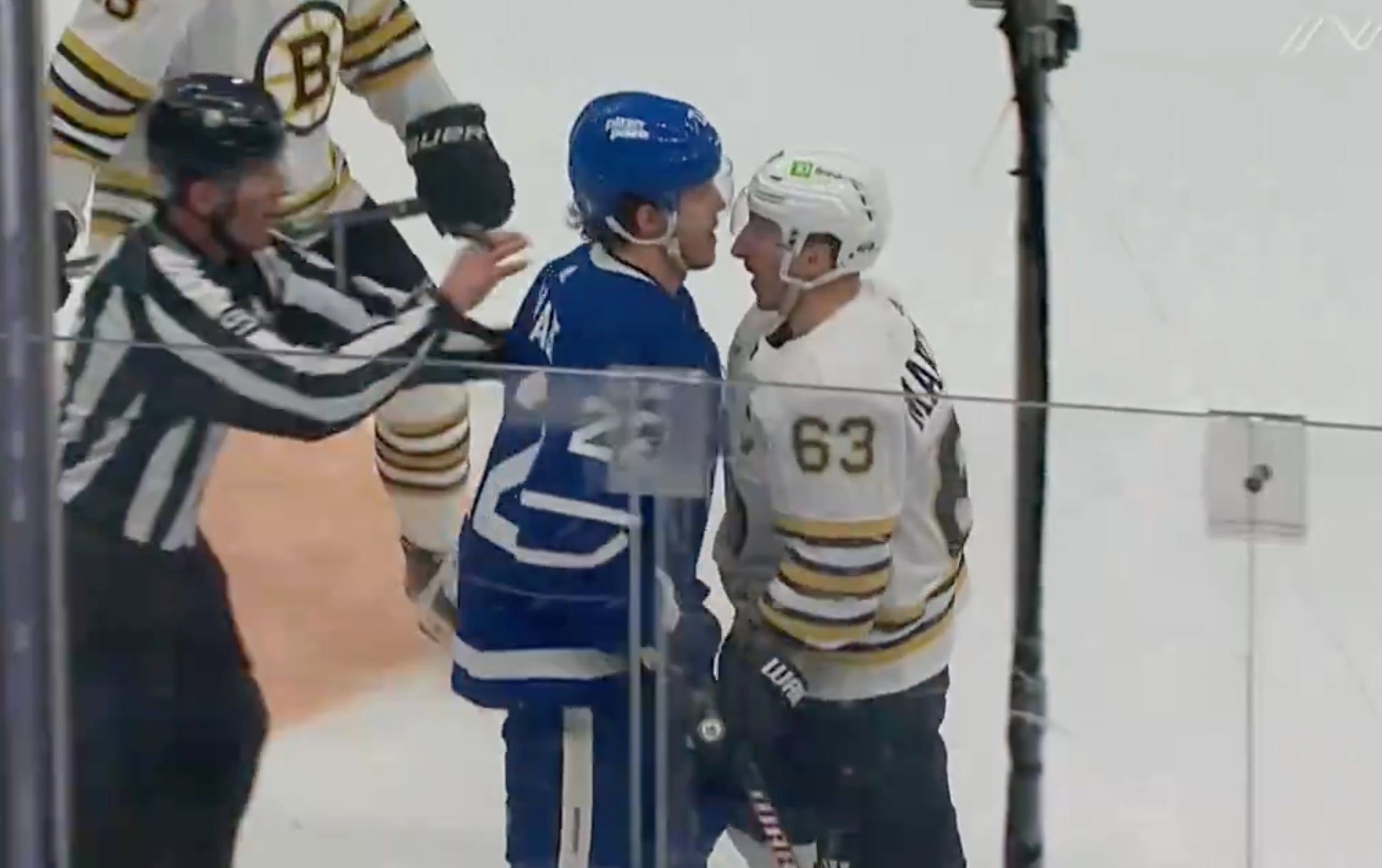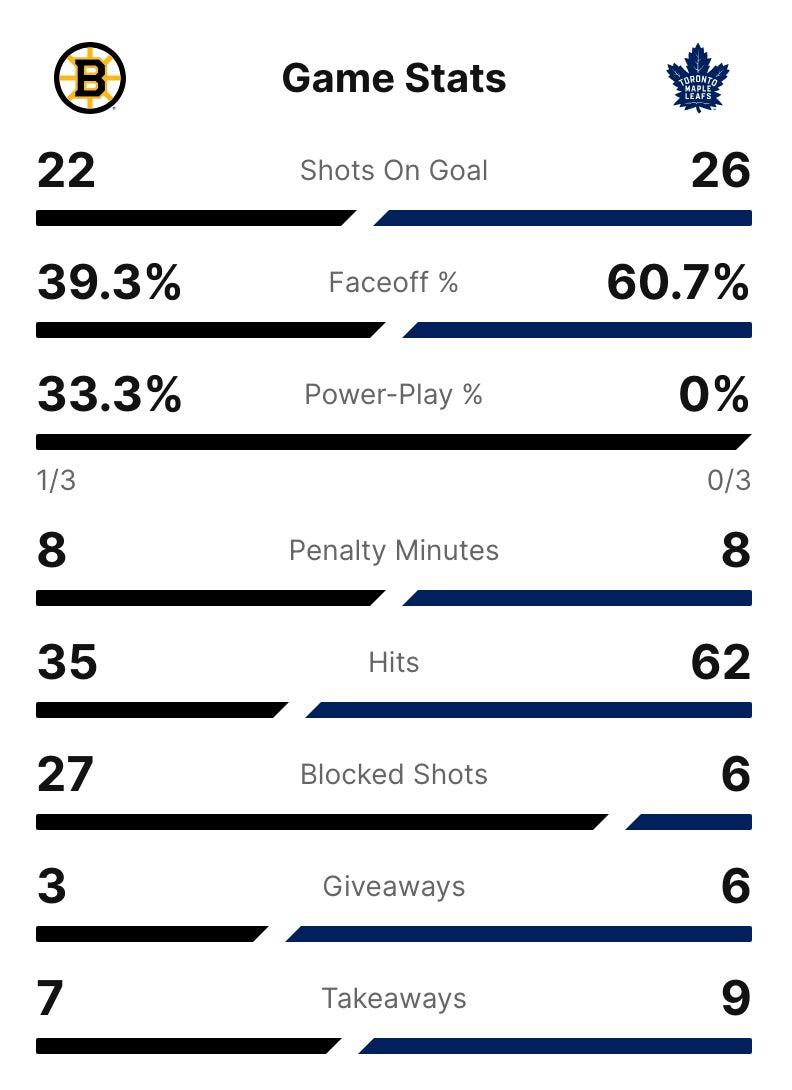 With 15 minutes to go, Mitch Marner got the Leafs on the board. Too much standing around for the B's. 3-1.