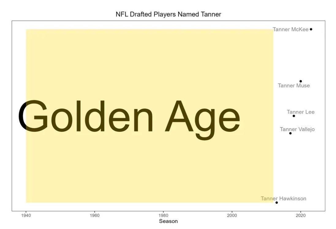I made this graph last year so it doesn't include 2024, but I think we can all agree the NFL was better when there were no Tanners. But they continue to proliferate in 2024 with Tanner McLachlan and even a new variant "Tanor" Bortolini. No known vaccine exists at this time to prevent future NFL Tanners, but there are working theories such as limiting alcohol consumption at club lawn bowling events.