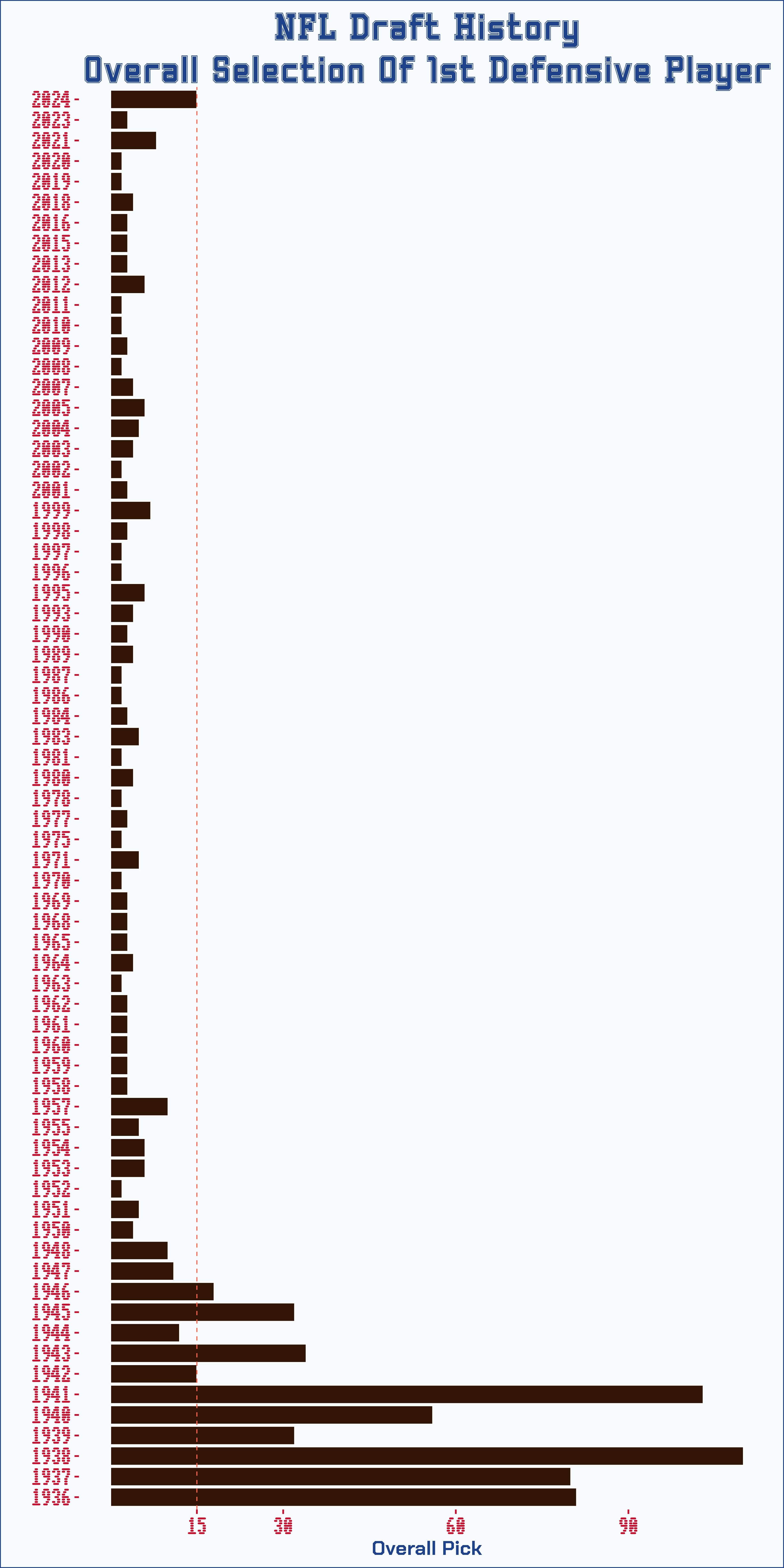 Oh great. Just what the NFL needs. More offense. It took 15 picks before a defensive player was selected when the Colts took defensive lineman, Laiatu Latu. Side note - my only explanation for what happened back in the day is that players were labeled in pro football reference as an offensive player and they played on both sides of the ball but maybe a real old head can explain wtf was going on there.