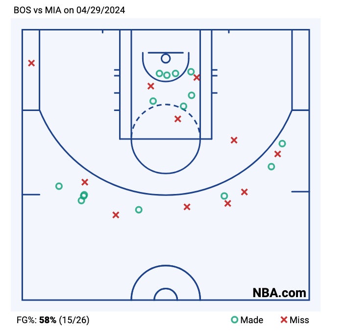 In looking at his shot chart, it's the perfect type of balance you want to see against a MIA defense, to the point where nothing they tried worked. Couldn't go zone, couldn't guard him in man/switch. It was the perfect balance of an inside/outside approach