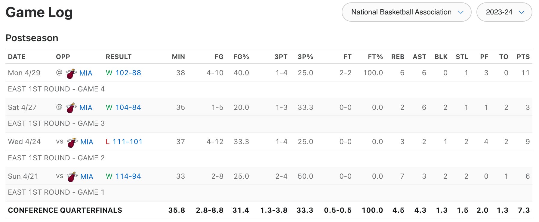 - Holding a team to under 90 points on their home floor in back to back games and under 95 points in 3 of the 4 games is legitimately insane. That should not be possible in 2024, regardless of what the other team looks like. 90 points? The worst offenses in the league are able to get 90 points in a 48 minute NBA game.