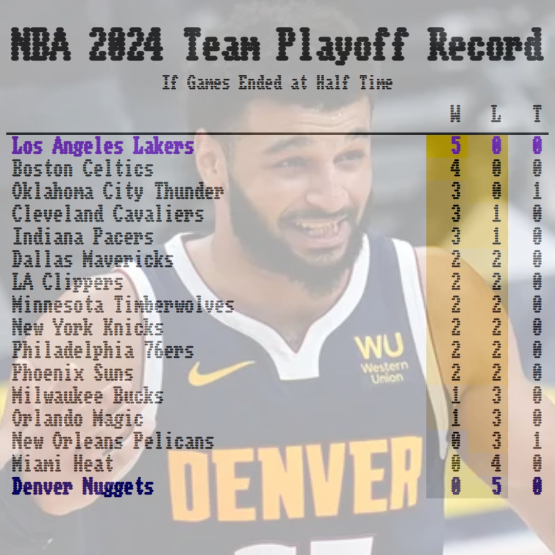 Exhibit A - The Lakers are actually the only team in the 2024 playoffs to go undefeated at 5-0 (if games only lasted the first half)
