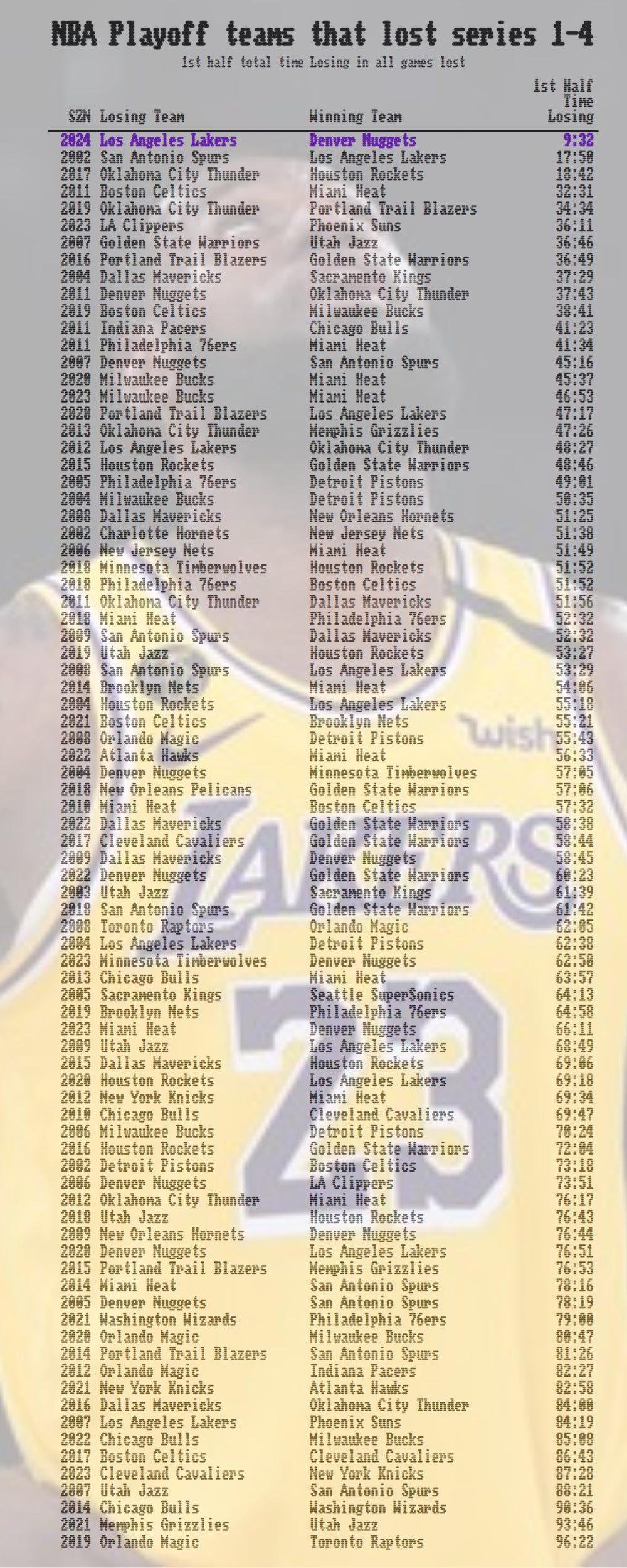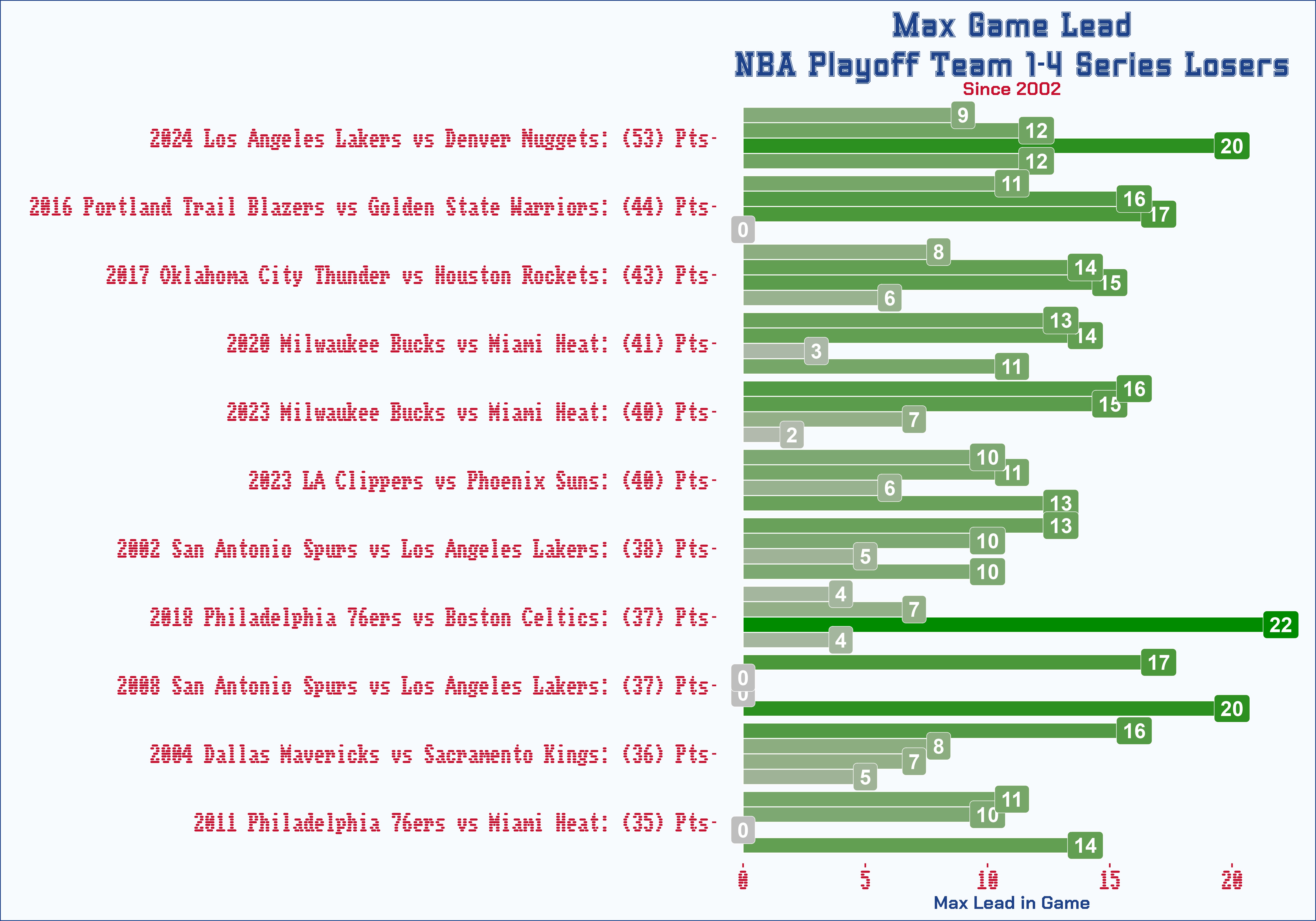 Whatever. The important thing is the 2024 Lakers lead the way with 53 total points in this…. up and coming measure of analytics. Here's the master list of any 1-4 series losing team since 2002 who totaled 35 or higher along with individual game largest leads: