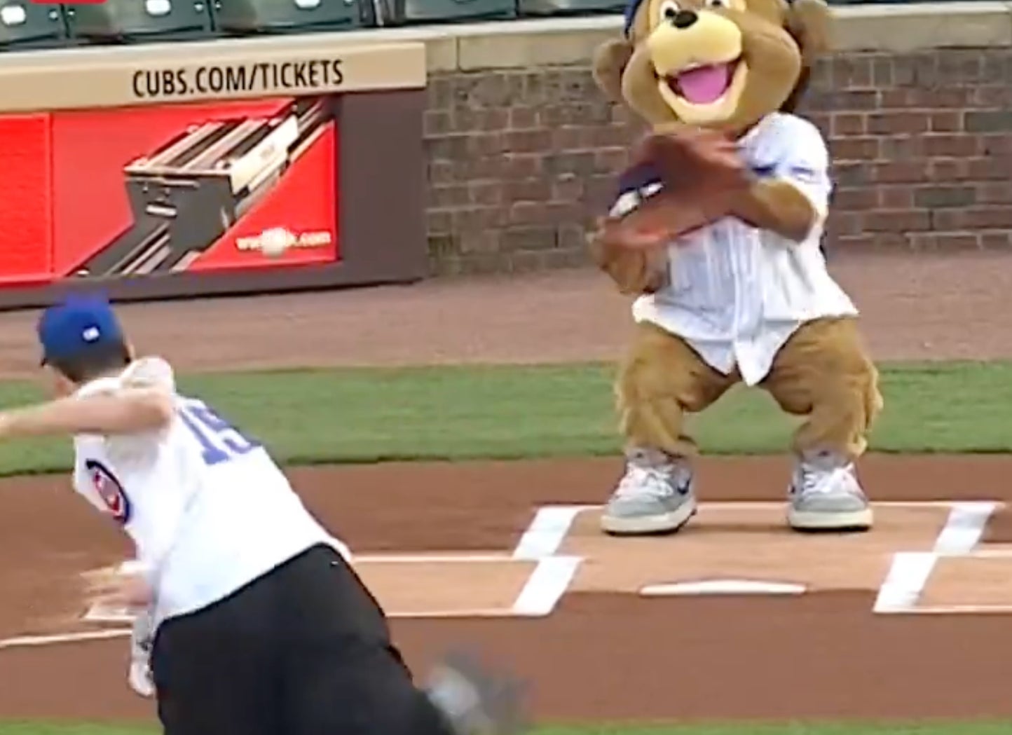 Yikes. Are we sure the ref didn't call a Foul on this? And are we putting this one the Mount Rushmore of worst first pitches? I'd like to think not, as it's not like he's at the 50 Cent level, but shouldn't his previous baseball experience be factored in? You'd think that someone who not only shined as a Pitcher, but also has a release point about 2 feet from the plate, should be able to come closer than the dugout to the Strike Zone. Maybe that's why it got the Cubs mascot to turn around with a "what the fuck?" as he went to retrieve the ball.