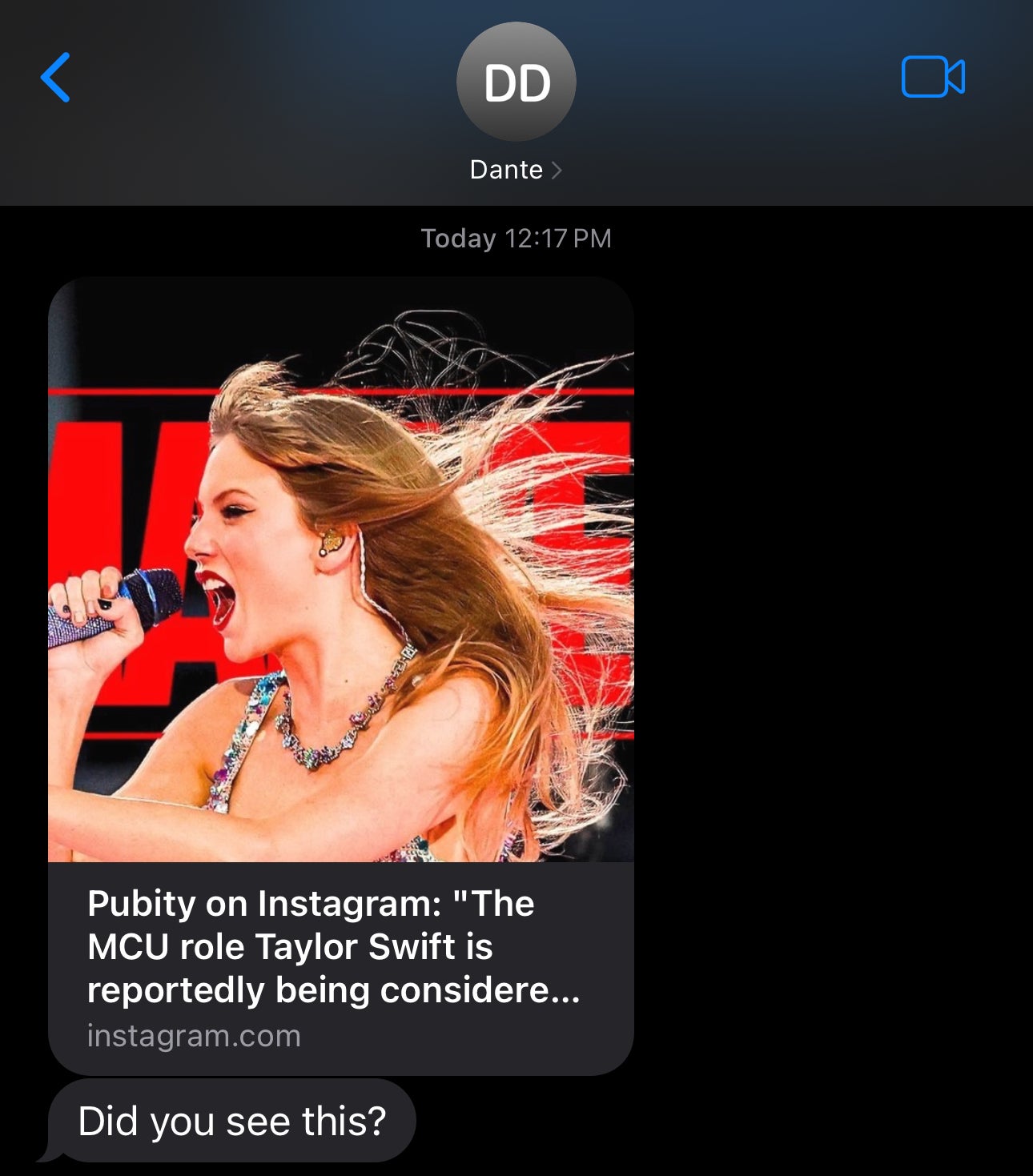 I've been getting texts like this for months now. No shade to my guy Dante who is just making sure I'm up on the news but I will say, if the news is Taylor Swift related, I've seen it. It's all I do. I wake up, I check for Taylor news. I'm scrolling my phone all day long going through convos on Twitter about XYZ rumors flying around, sifting through fake reports and stories planted to get engagement. The problem isn't the fact that Dante texted me, it's WHAT he texted me. A link to this "viral news" instagram account with 38 MILLION followers, Pubity: