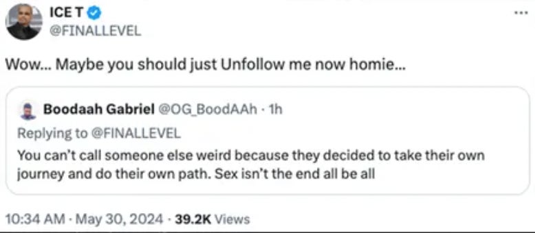Ohhhh hate, hate, hate, hate, HATE! If you don't know what that's in reference to you can stop reading this blog now. There truly is no one better at hating than Ice-T. Lenny Kravitz choosing not to have sex doesn't affect anyone but Lenny Kravitz…so why is Ice involved? Simple…because he's a hater. That's really all there is to it. He couldn't have less of a dog in the race, yet he's choosing to publicly inject himself into the situation. I love it.  Also, calling someone a "weirdo" is low key a brutal insult.