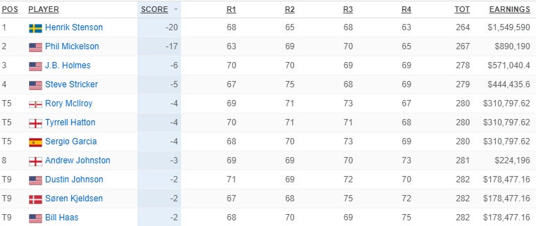 Both balled out on the front 9 to create an ocean between themselves and the pack and found themselves tied on the 14th tee. Stenson birdied 14, 15, and 16 with Mickelson narrowly missing an eagle putt on 16. That opened up a 2 shot lead for Stenson that he would close out with authority with a birdie for 63 on 18. It was a record low aggregate score of 264 that at the time stood alone as the lowest in major championship history, which was since matched and then broken by Xander Schauffele this year at Valhalla.