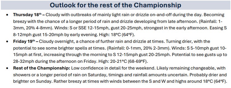 Looking like some PROPER Open golf weather here. Temps ranging somewhere between 50 and 70 degrees with high variability of wind and rain mixed in throughout the week. Tee time splits are never as critical for betting and DFS purposes like they are for this championship, so keep a close eye on the forecast as it evolves. Friday is going to be phenomenal with gusts up to 40 mph as guys grind to make the weekend. Inject that shit in my veins baby.