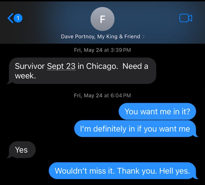 Not me though. Dave Portnoy, right down the middle, my friend, boss, mentor, but mostly friend. That's how I knew him. That's how I thought we would text over the ensuing years.