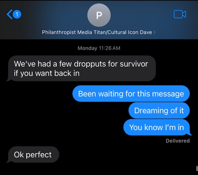 I believe Erika once said in an interview that she would text employees on the weekend, evaluating their professional commitment by the number of minutes it took them to respond. You'll notice that in the above exchange, I didn't get back to Dave for two hours and twenty-five minutes. That's an eternity. But when you've been in an on-again, off-again text relationship with your boss for the better part of a decade, you learn to hold your goddamn horses. For the first time in recent memory, I held the cards. You want me to be part of our premier game show? Let me weigh it, bud. Let me toss that shit around.