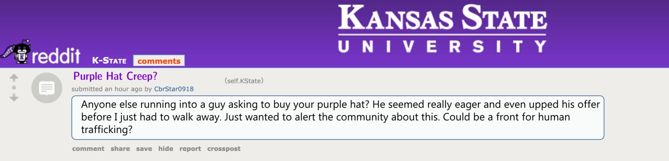 Klemmer and I eventually found Boozies Bar and Grill in downtown Davenport, and thanks to the good lord above (tim tebow) the kitchen was still open. We shared a couple cold bevs and reminisced on the hardships we faced on our noble quest, lengthy in both distance and time elapsed. If you stuck a random pair of guys like me and Chris Klemmer together, it would be hard to know what to expect. The students of Kansas State encountered this first hand when someone thought our purple hat bartering was code for human trafficking.
