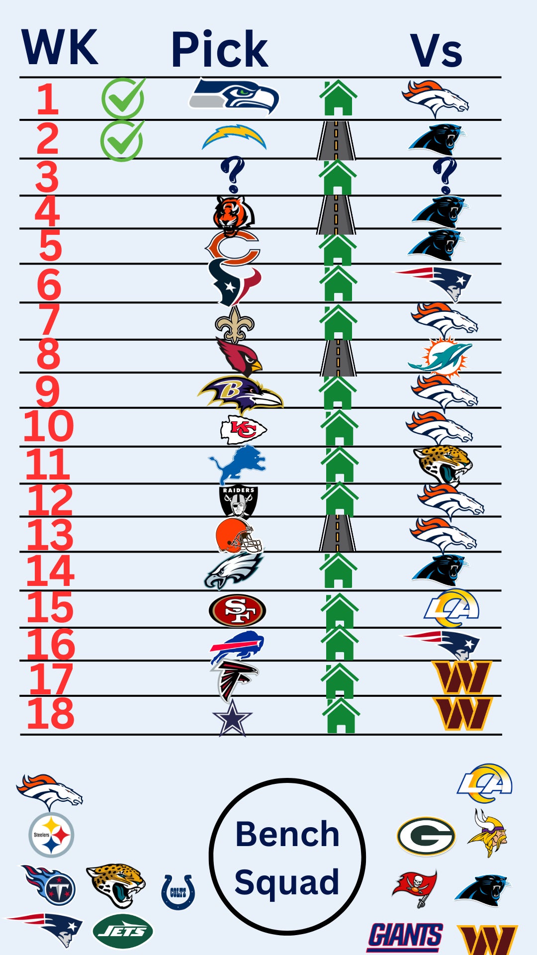 Baker Mayfield is for real. It's time to embrace this fact. Haven't heard a peep out of Colin Cowherd lately on him. This could be a great selection to sneak in while the rest of your league takes stock in the 49ers or Bengals. Just remember - they've faded the big spreads twice before. But the Broncos may just be a team to follow. Bo Nix looks pretty damn bad. Like a fly going around in circles with no plan. Just reactions. I was hoping to save them for Week 17 when they host the Panthers, but that's so far away. I think another matchup might make itself available. Definitely putting the Bucs as a contender for Week 3.