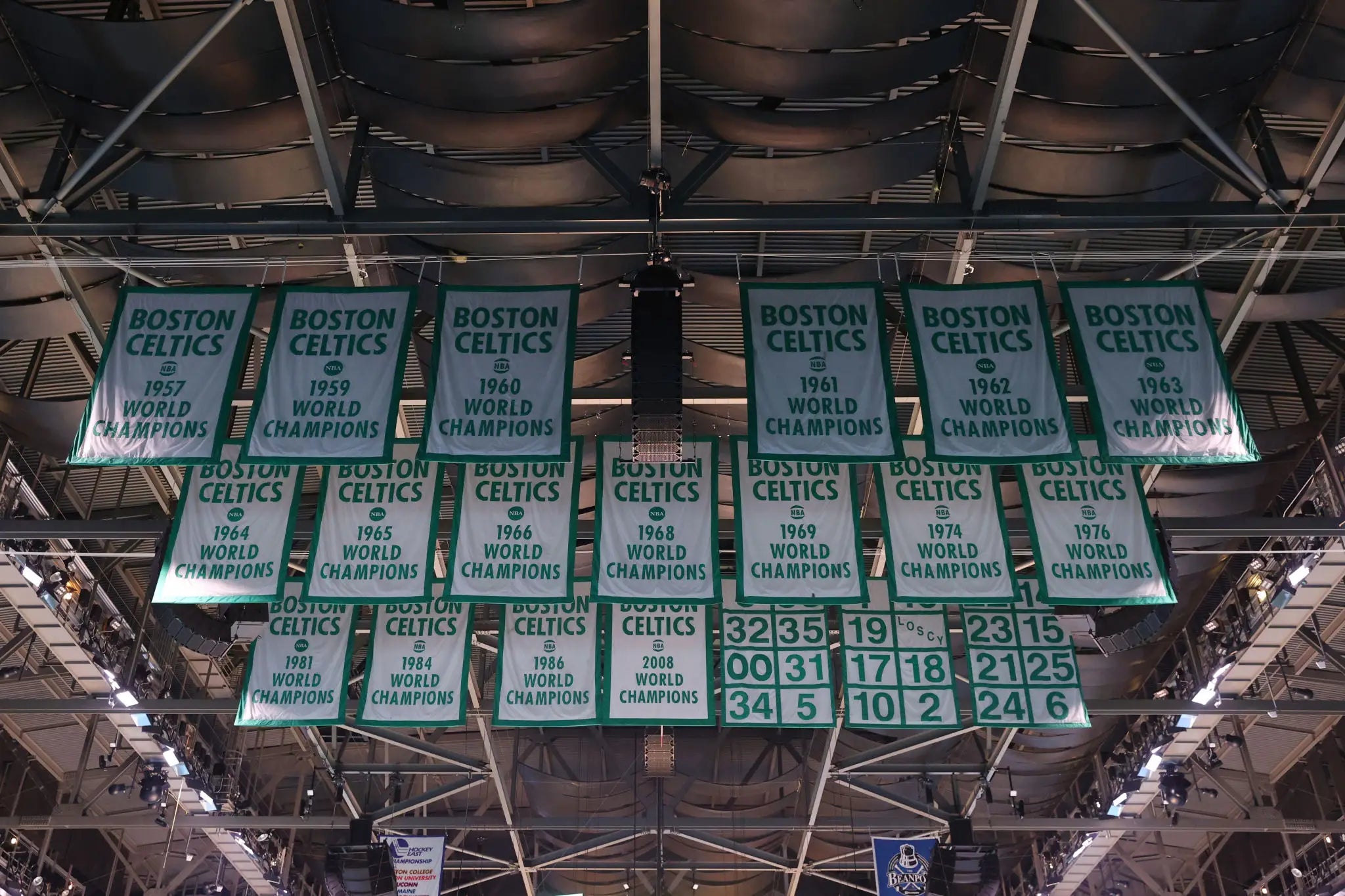 That's it. Anything else is not worthy of the honor of being raised to the rafters. No division banners, no Eastern Conference Finals banners, (hopefully) no In Season Tournament Banners, just the real deal. It helps set the tone that the only thing that matters in the organization is the title. Every second of every day is about raising a championship banner and a championship banner only. If you finish the year with anything other than a championship banner, the season was a failure. It doesn't matter how many games you win, it doesn't matter how deep in the playoffs you went. If you don't win, you don't raise a banner.