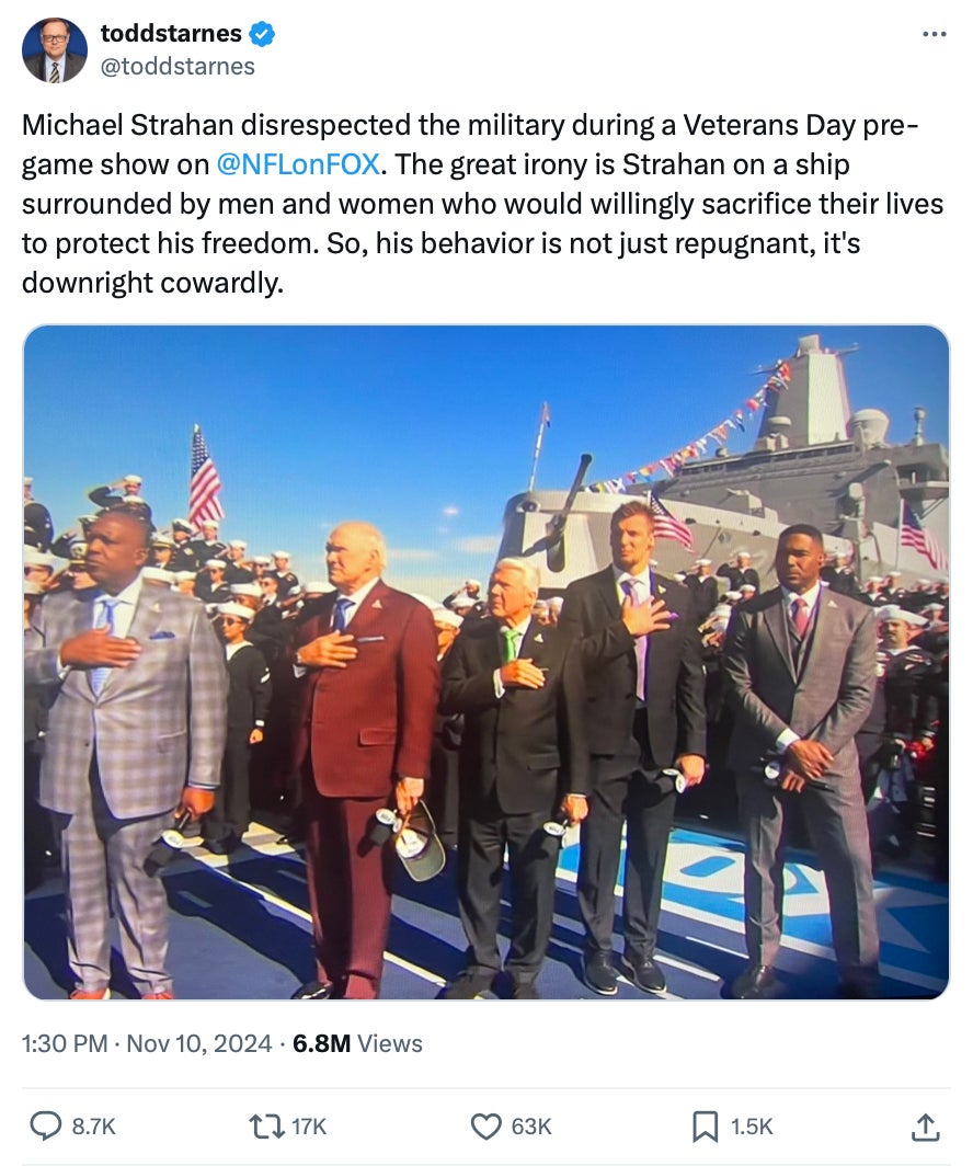 This Todd Starnes guy has a huge platform but has posted nothing for Veterans Day, has amplified zero cool stories, thanked no one and, though unsurprising, that is totally fine. He doesn't owe anyone a thing. What sucks is that he used the son of an honorable veteran for outrage clicks, which tells me he only suPpOrTs tHe TrOopS when they can serve him in some way.